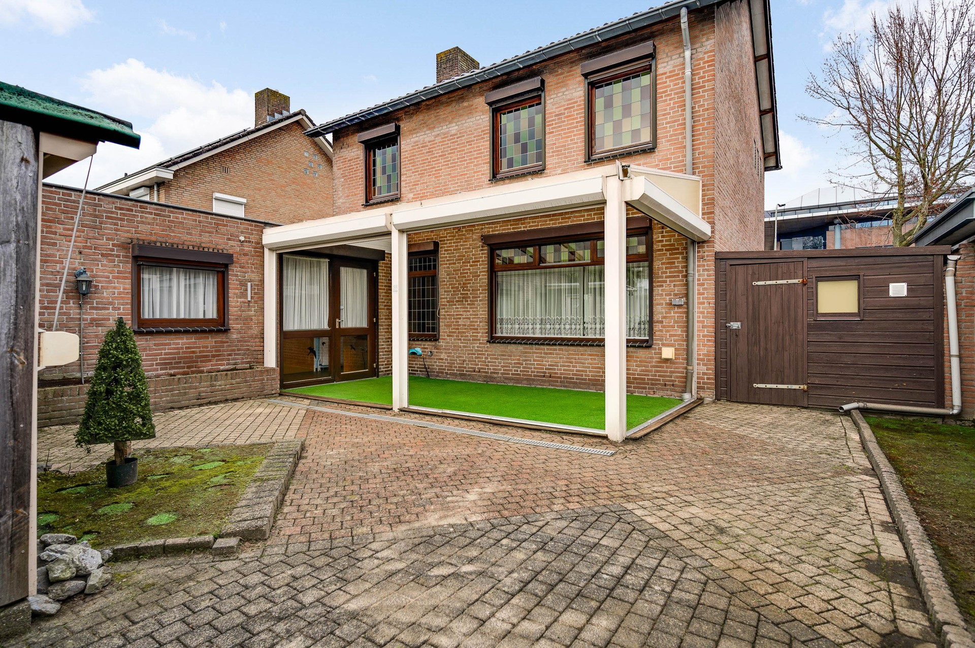 De woning beschikt over een diepe oprit met toegang tot de garage. De tuin is zuid georiënteerd en voorzien van een overkapping met inbouwspots, waardoor je hier het hele jaar door comfortabel kunt zitten. De overkapping is aangelegd met kunstgras en kan worden afgesloten met elektrisch bedienbare rolluiken. Aan de zijgevel van de woning staat een houten tuinhuis met elektra, ideaal voor extra opslag of als werkruimte.