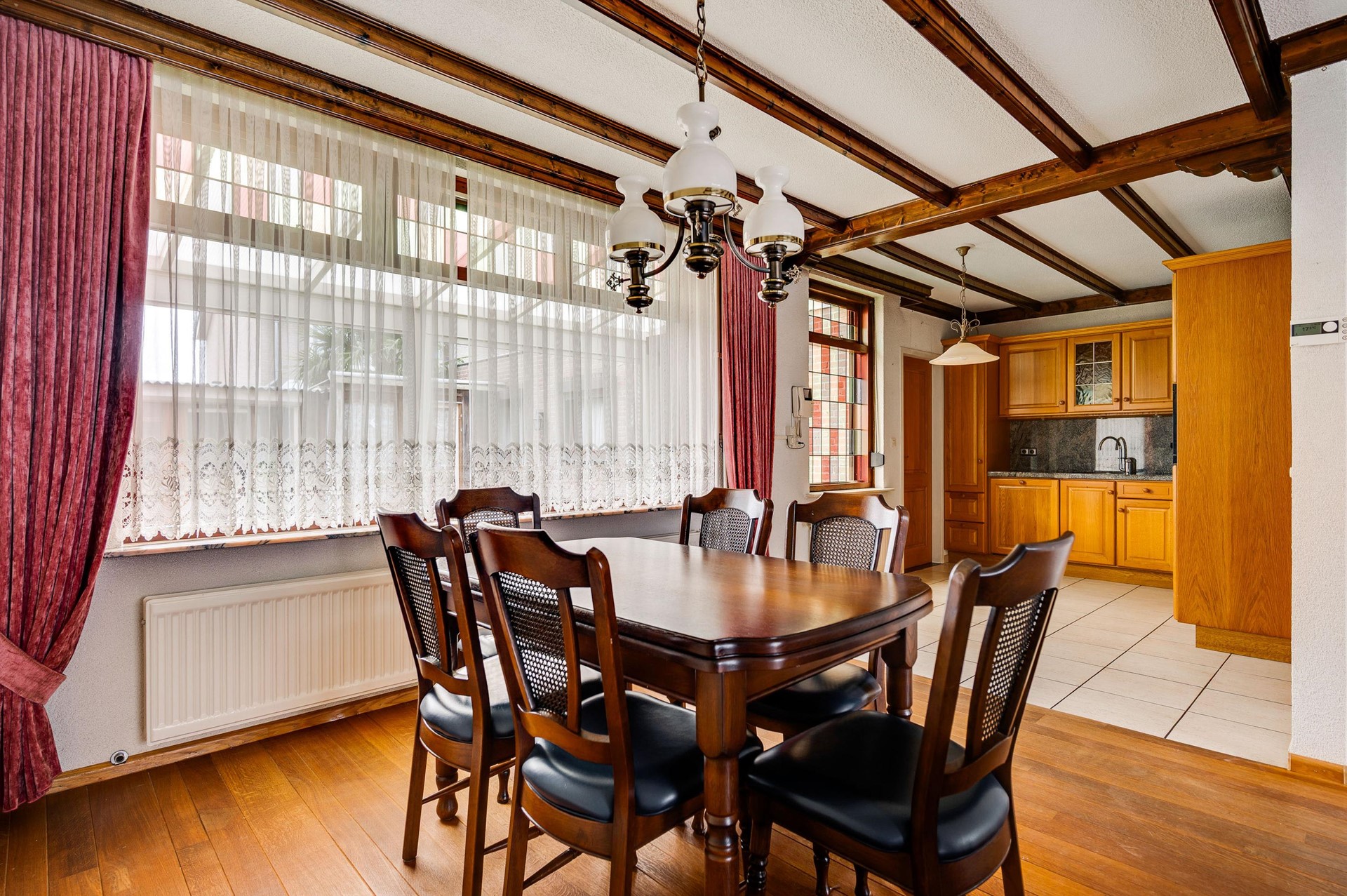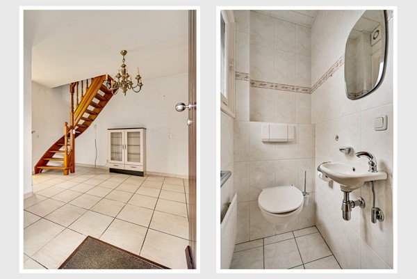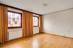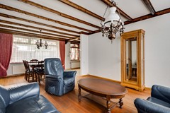 Via de diepe oprit bereik je de entree van de woning. De ruime ontvangsthal is praktisch ingedeeld en voorzien van een apart toilet met fontein, verwarming en mechanische afzuiging. Daarnaast bevinden zich hier de meterkast, houten trapopgang, garderobe en de doorgang naar zowel de keuken als de woonkamer. De doorzonwoonkamer is licht en ruim, met grote raampartijen aan beide zijden. Aan de achterzijde zijn elektrisch bedienbare rolluiken geplaatst, wat zorgt voor comfort en privacy. De woonkamer vormt een fijne basis om geheel naar eigen smaak te moderniseren.