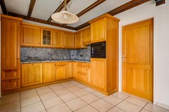 De open keuken is uitgevoerd met een granieten werkblad en voorzien van diverse inbouwapparatuur, waaronder een AEG inductiekookplaat, afzuigkap, vaatwasser, magnetron en koelkast. Vanuit de keuken is er toegang tot de diepe bijkeuken. De bijkeuken is royaal opgezet en beschikt over witgoedaansluitingen, vaste bovenkasten, een wasbak en toegang tot de tuin met overkapping, de kelder en de garage. De grote, droge kelder biedt volop bergruimte en is ideaal voor opslag.