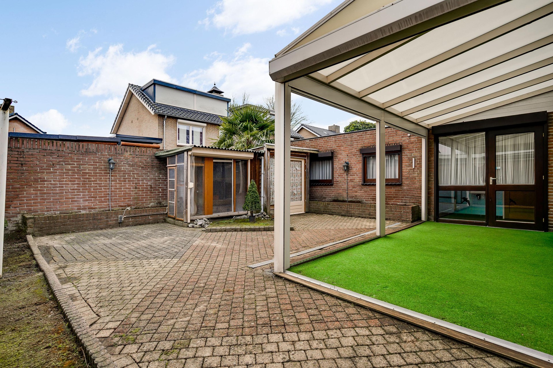 - Zuid georiënteerde tuin met overkapping en kunstgras, afsluitbaar met elektrische rolluiken
