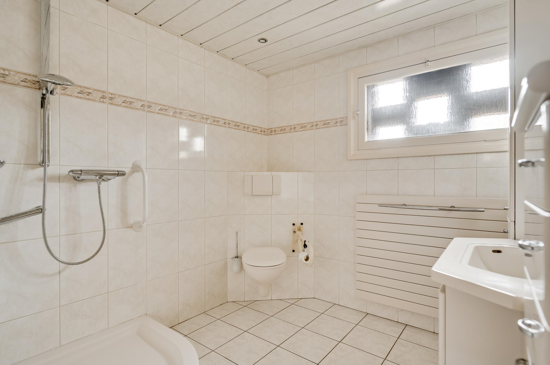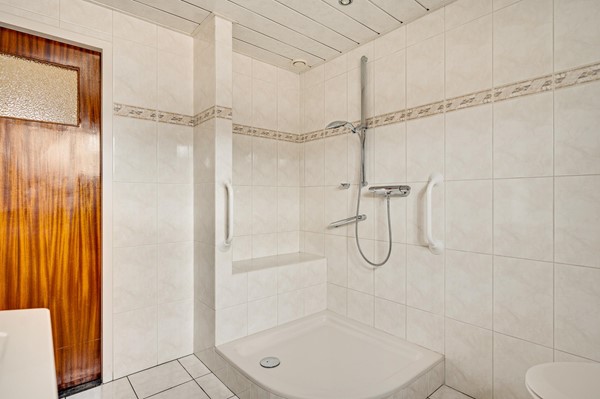 - Ruime badkamer met douche, wastafelmeubel, toilet en mechanische afzuiging