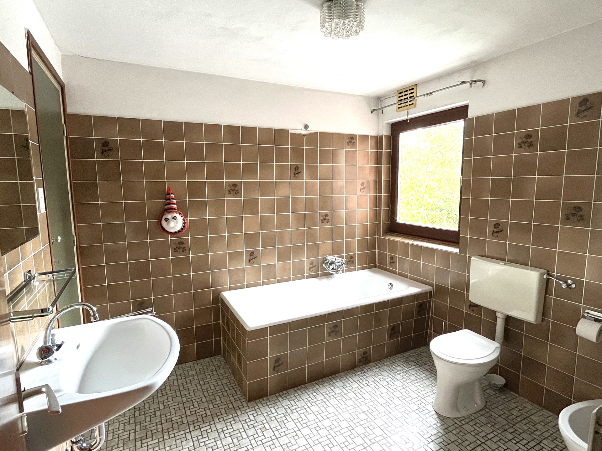 Deze ruimte is betegeld, voorzien van een ligbad, wastafel, bidet en toilet.