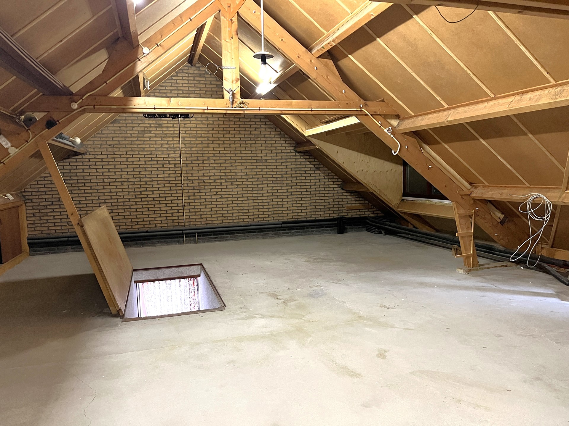 De zolder is voorzien van een betonnen dek en een houten balkconstructie. Het dak is geheel beschoten met isolerende plaat.