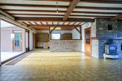 L-vormige woonkamer met schouw voorzien van houtkachel