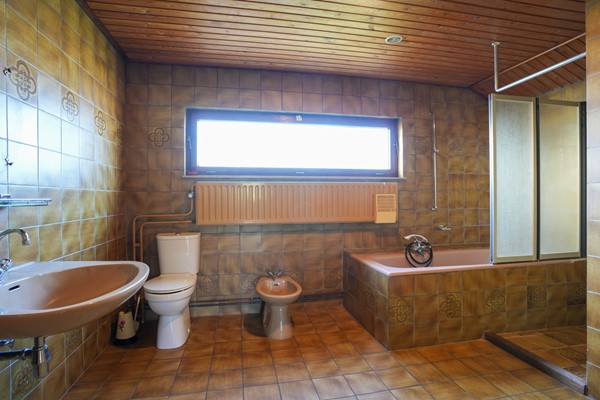 Badkamer voorzien van ligbad, douche, wastafel, staand closet en bidet