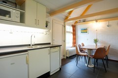 Open keuken met 4-pits gaskookplaat, afzuigkap, vaatwasmachine, losstaande magnetron en koelkast met vriesvakje