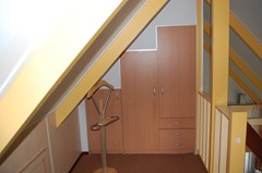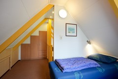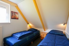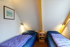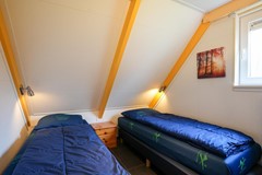 Slaapkamer vide met twee boxspring bedden, inbouwkast met safe en privé-opslagruimte niet toegankelijk voor verhuur.
