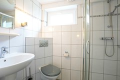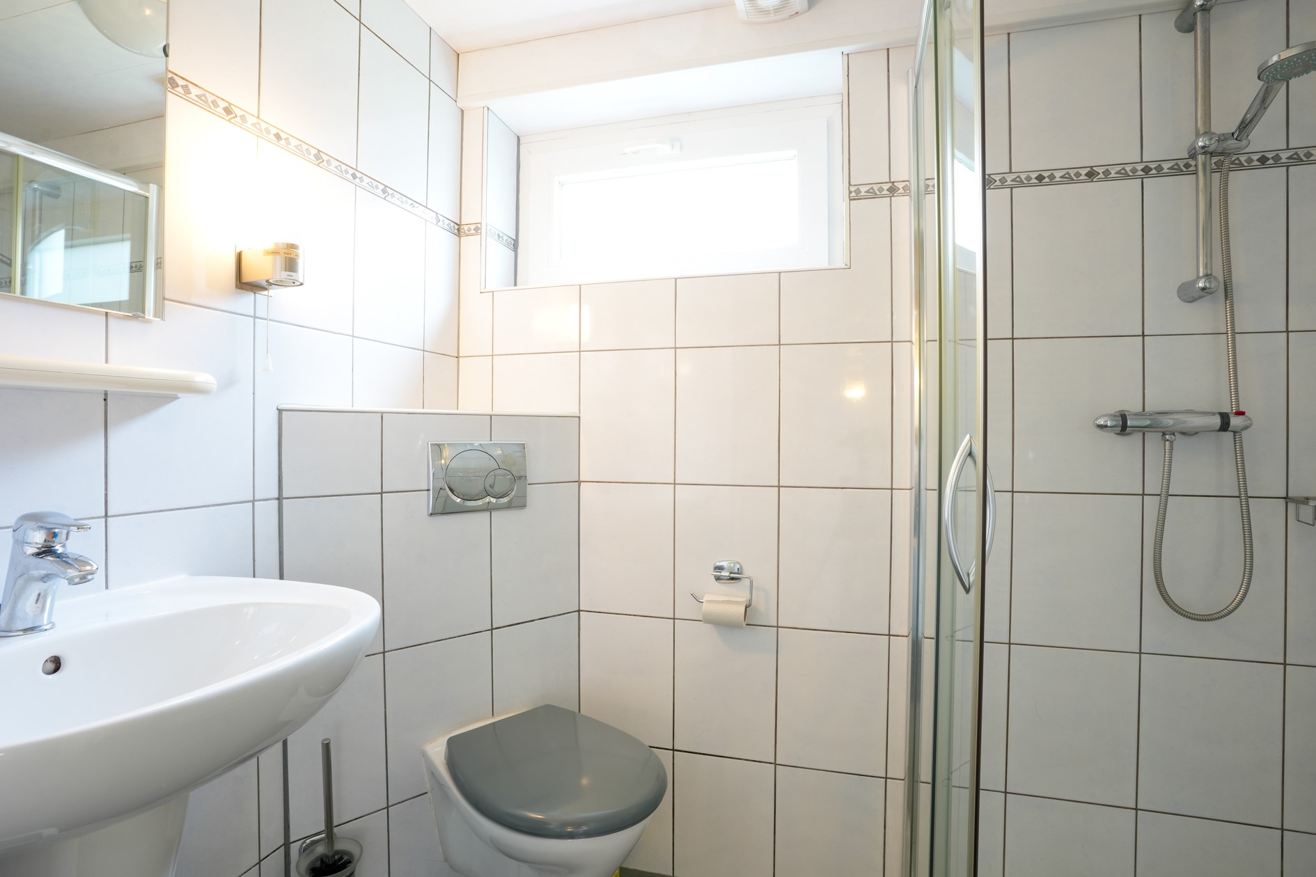 Badkamer met douche, hangend toilet, vaste wastafel en mechanische afzuiging voorzien van een sensor