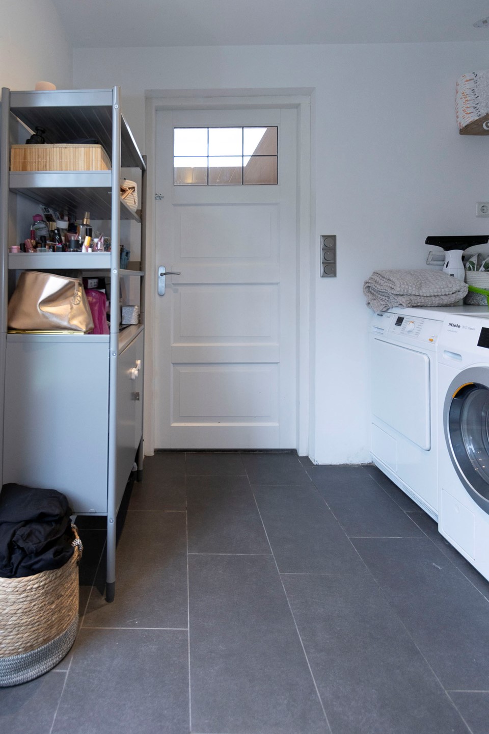 Aansluitend aan deze aanbouw een compacte doch verrassend praktische extra aanbouw waarin gesitueerd zijn: wasautomaat en -droger aansluitingen en vervolgens een fijne badgelegenheid en een fraai wastafelmeubel.