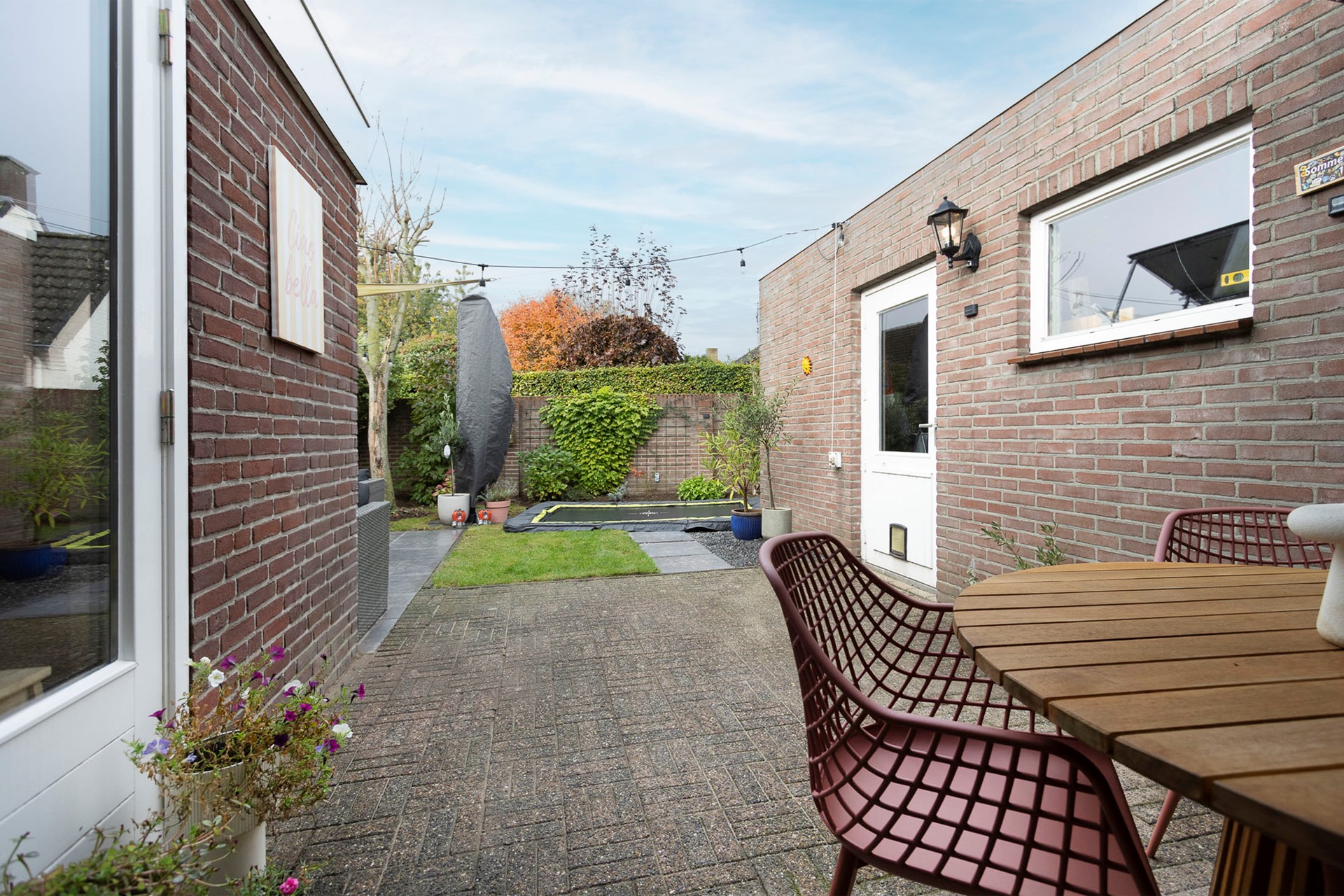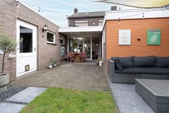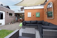 Aan de achterzijde van de 2e aanbouw is een heerlijk en knus terras aangelegd waar het zomers heerlijk toeven is. De intieme tuin op het zuidwesten laat je heerlijk genieten van het buitenleven.
