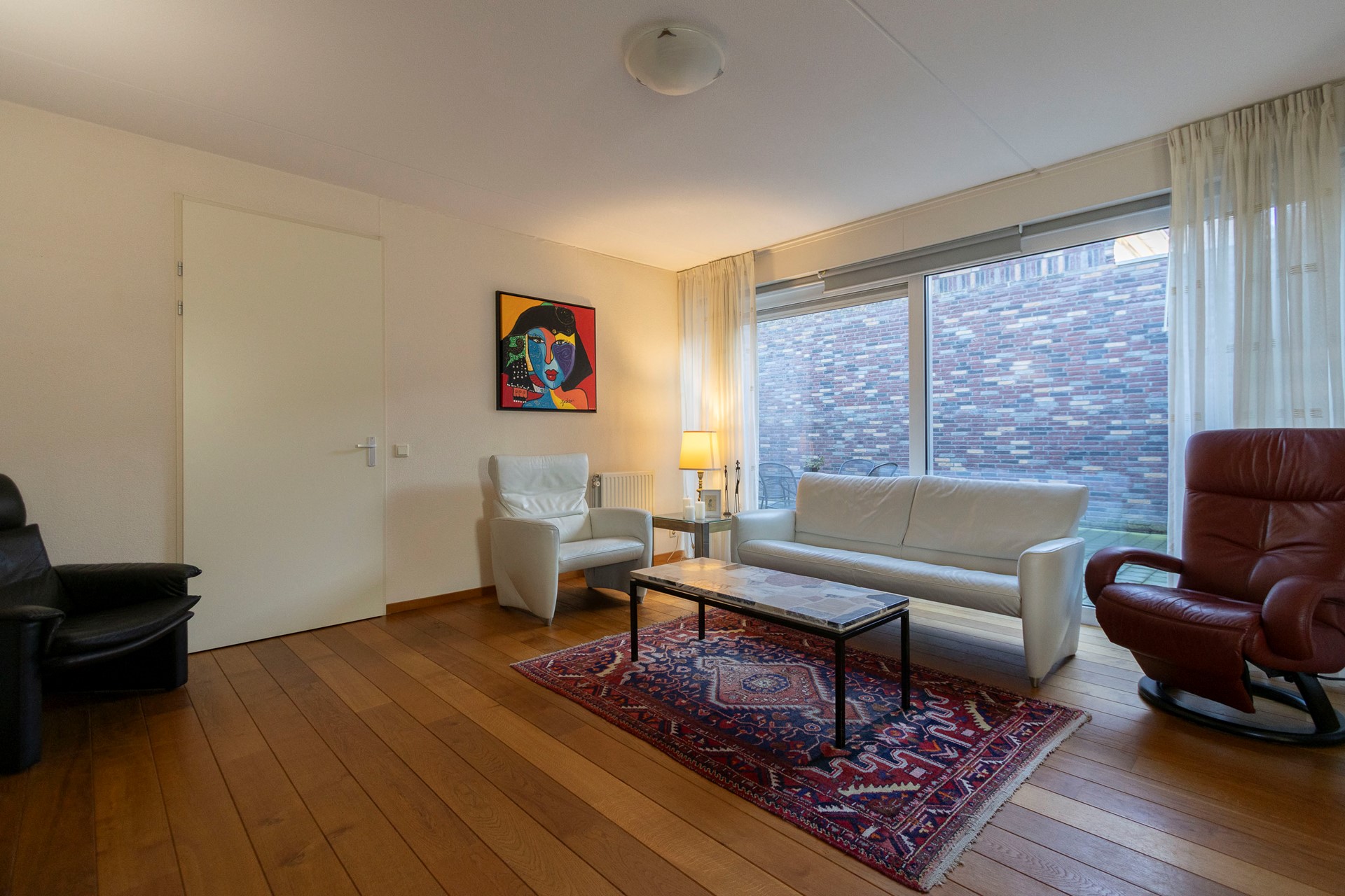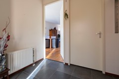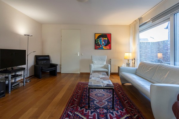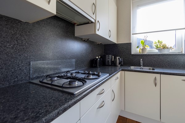 Je betreedt de woning via de hal, die toegang biedt tot de meterkast, berging, woonkamer en houten trap. De lichte woonkamer, met houten vloer, valt op door de brede schuifpui naar de patio-tuin en de prettige hoeveelheid daglicht die hierdoor binnenvalt. Aangrenzend bevindt zich de open keuken, uitgerust met diverse inbouwapparatuur zoals een koelkast, vaatwasser, oven en 4-pits gasfornuis.