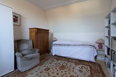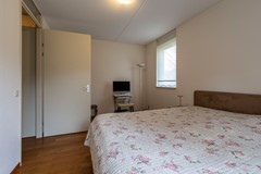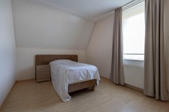 De slaap- en badkamer op de begane grond maakt deze woning levensloopbestendig. Via de slaapkamer is de tuin ook toegankelijk. In deze slaapkamer loopt de houten vloer van de woonkamer naadloos door. Direct naast deze kamer ligt de badkamer, voorzien van de benodigde sanitaire voorzieningen zoals een inloopdouche en wastafel met meubel. Tegenover de badkamer bevindt zich een apart, ruim toilet met fontein.
