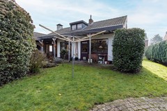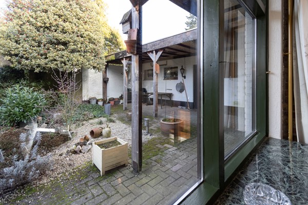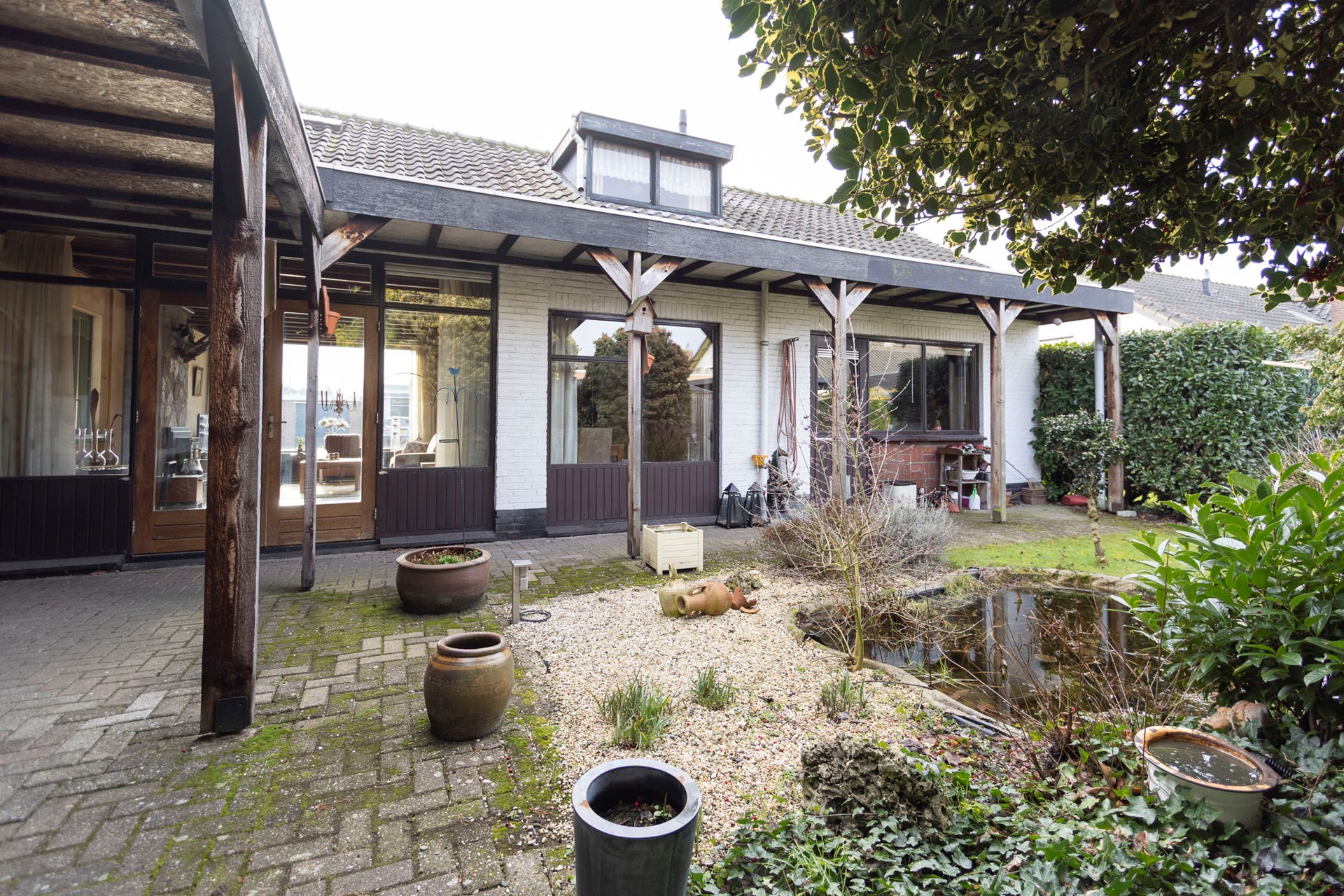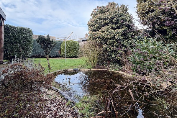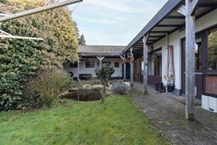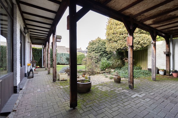De tuin rondom het huis is knus en sfeervol ingericht. De binnenplaats vormt een beschutte plek om te relaxen, terwijl de vijver een speels accent geeft. Dankzij de privacy en het onderhoudsvriendelijke karakter van de tuin, kun je hier zorgeloos genieten. De ruime oprit en carport zorgen voor voldoende parkeergelegenheid op eigen terrein en via een poortje is de achterom eenvoudig bereikbaar.