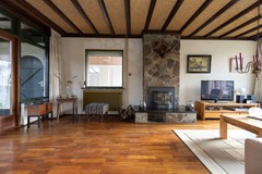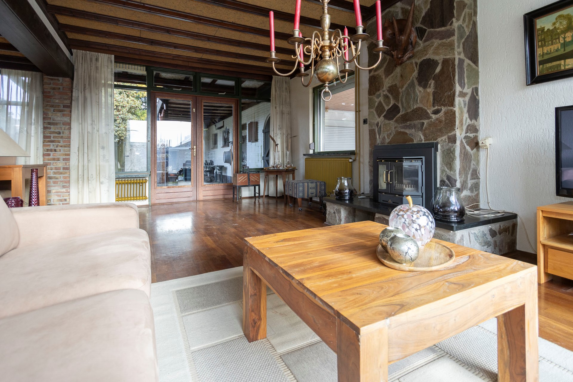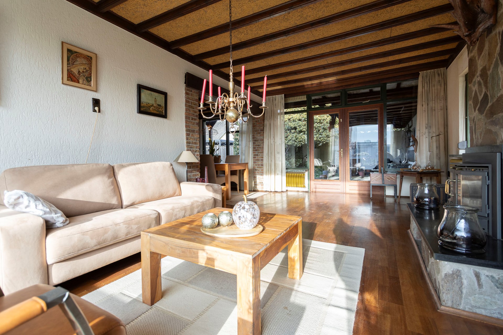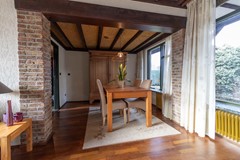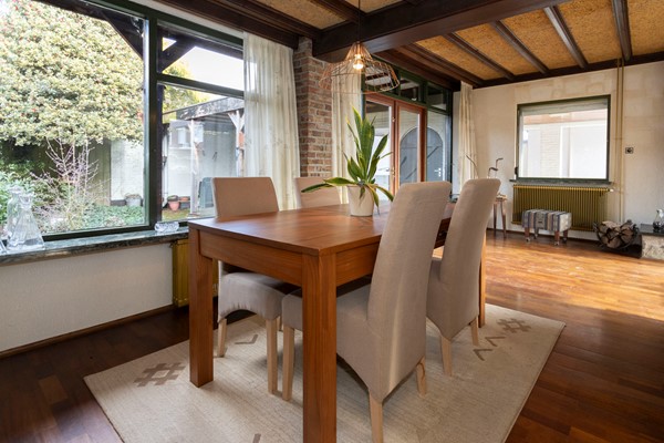 De lichte woonkamer met houten vloer wordt gekenmerkt door de grote ramen en openslaande deuren naar de tuin, waardoor binnen en buiten mooi in elkaar overlopen. De authentieke houthaard met bijzondere schouw vormt het gezellige hart van de kamer. Dankzij de L-vormige indeling zijn de eet- en zithoek sfeervol van elkaar gescheiden.