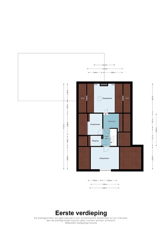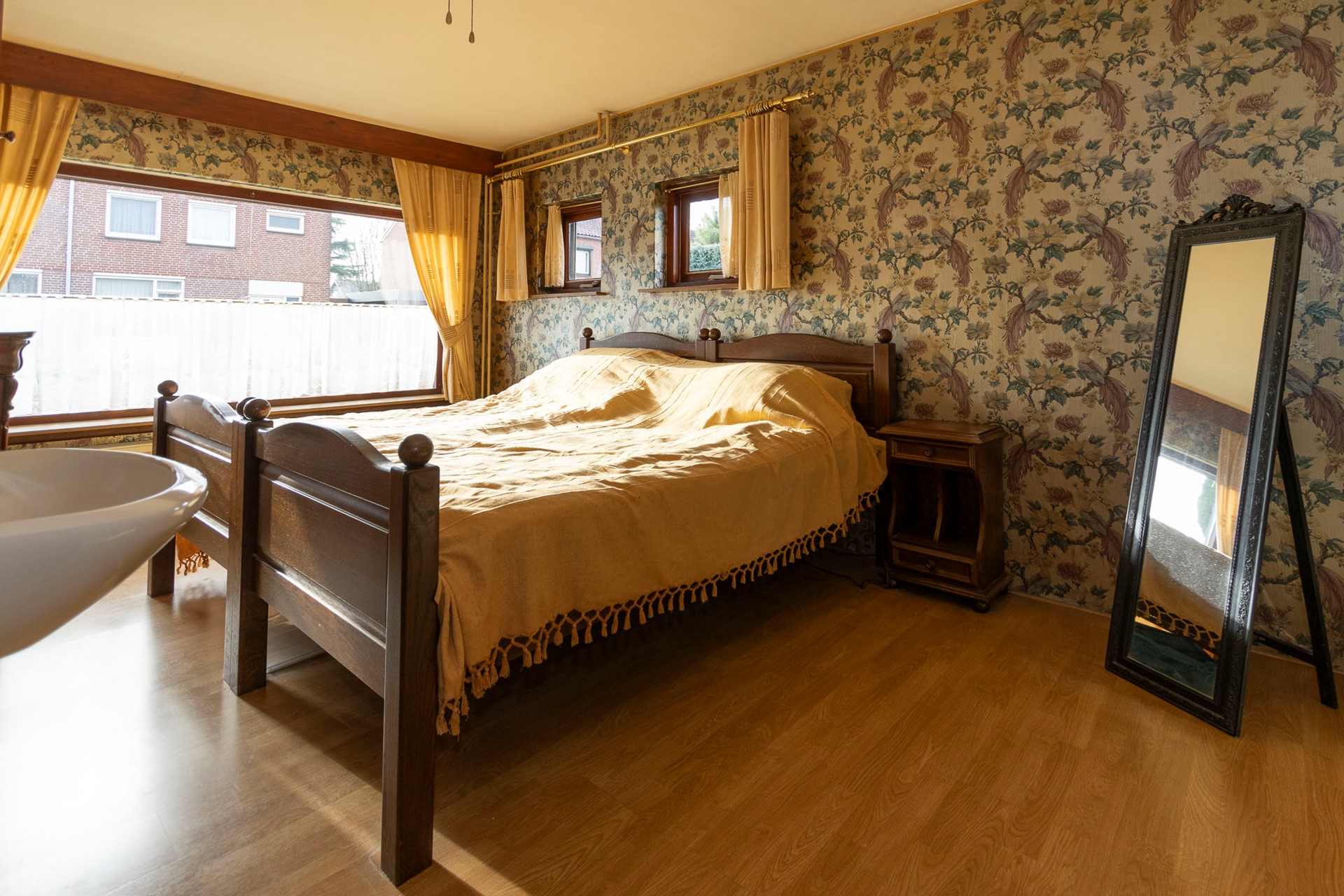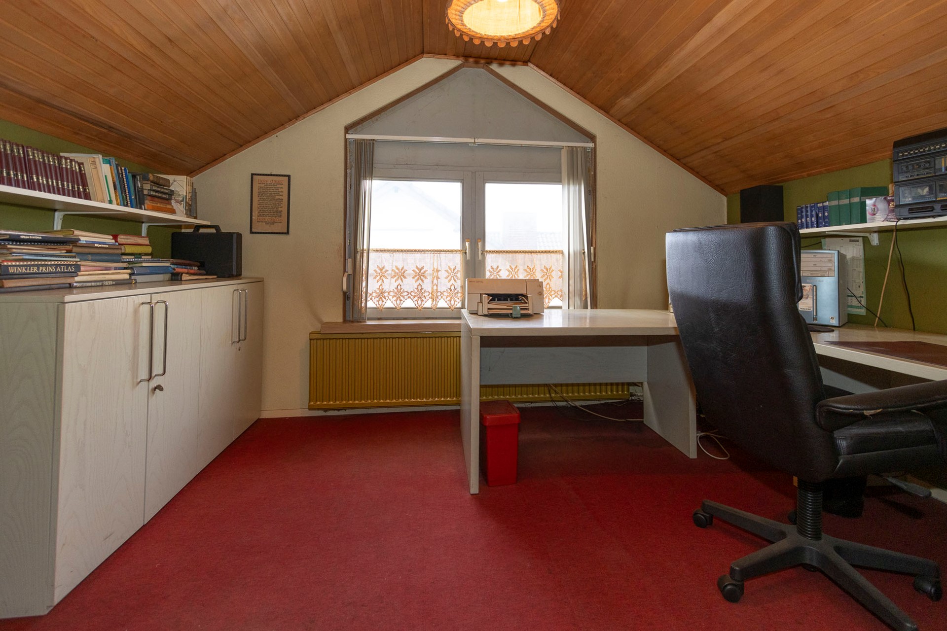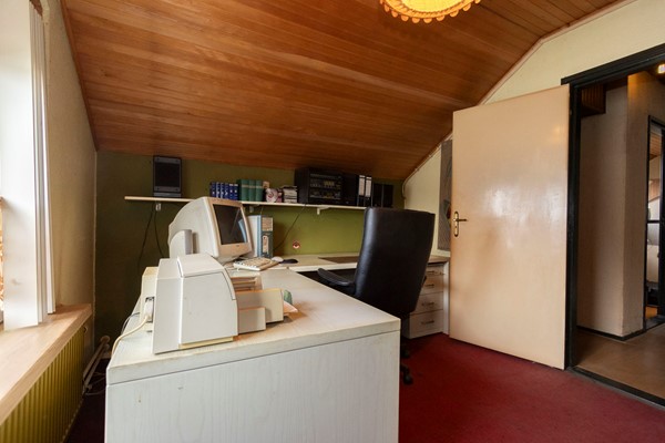 Op de eerste verdieping zijn drie slaapkamers aanwezig, waarvan een momenteel dienstdoet als werkkamer. Een van de slaapkamers beschikt over een dakkapel, wat extra licht en ruimte biedt. De derde kamer, met hoge nok, is te bereiken via enkele traptreden en doet dienst als extra (slaap)kamer. Voor deze doorgang is nog een extra bergruimte beschikbaar.