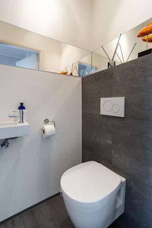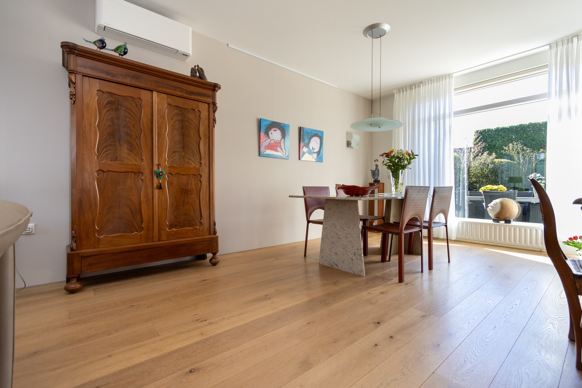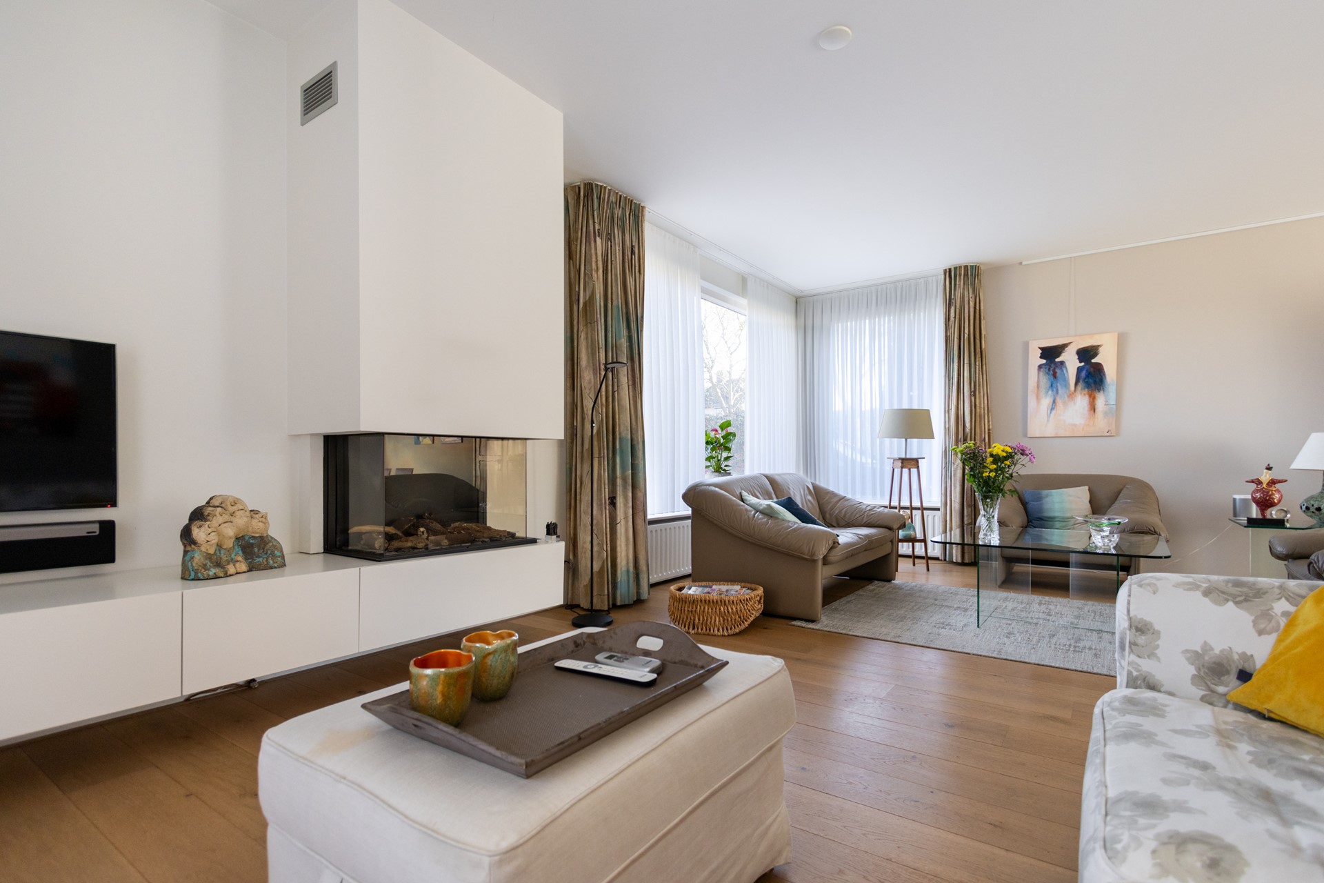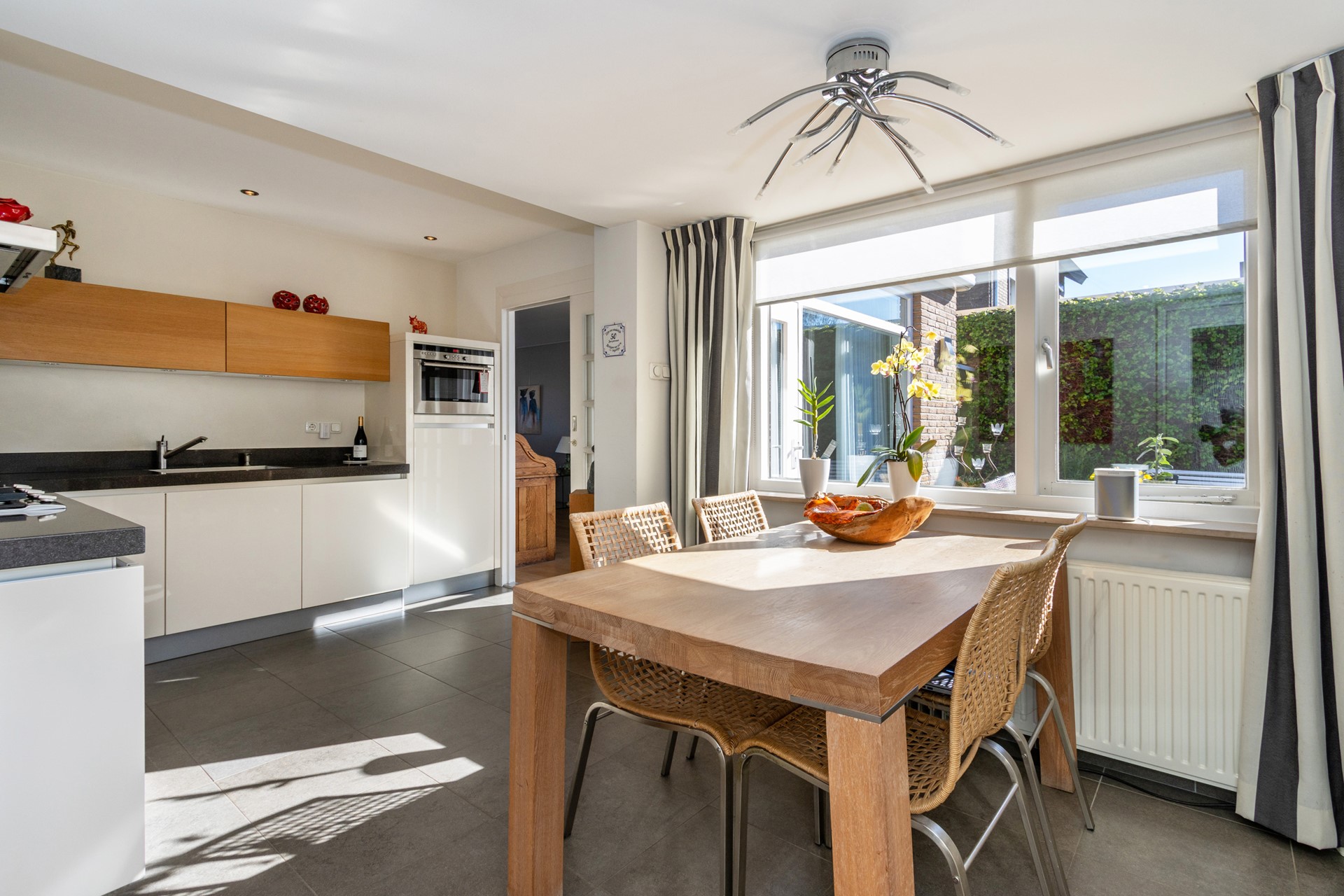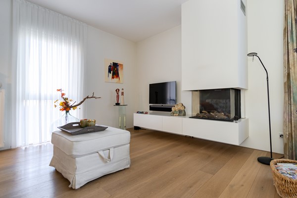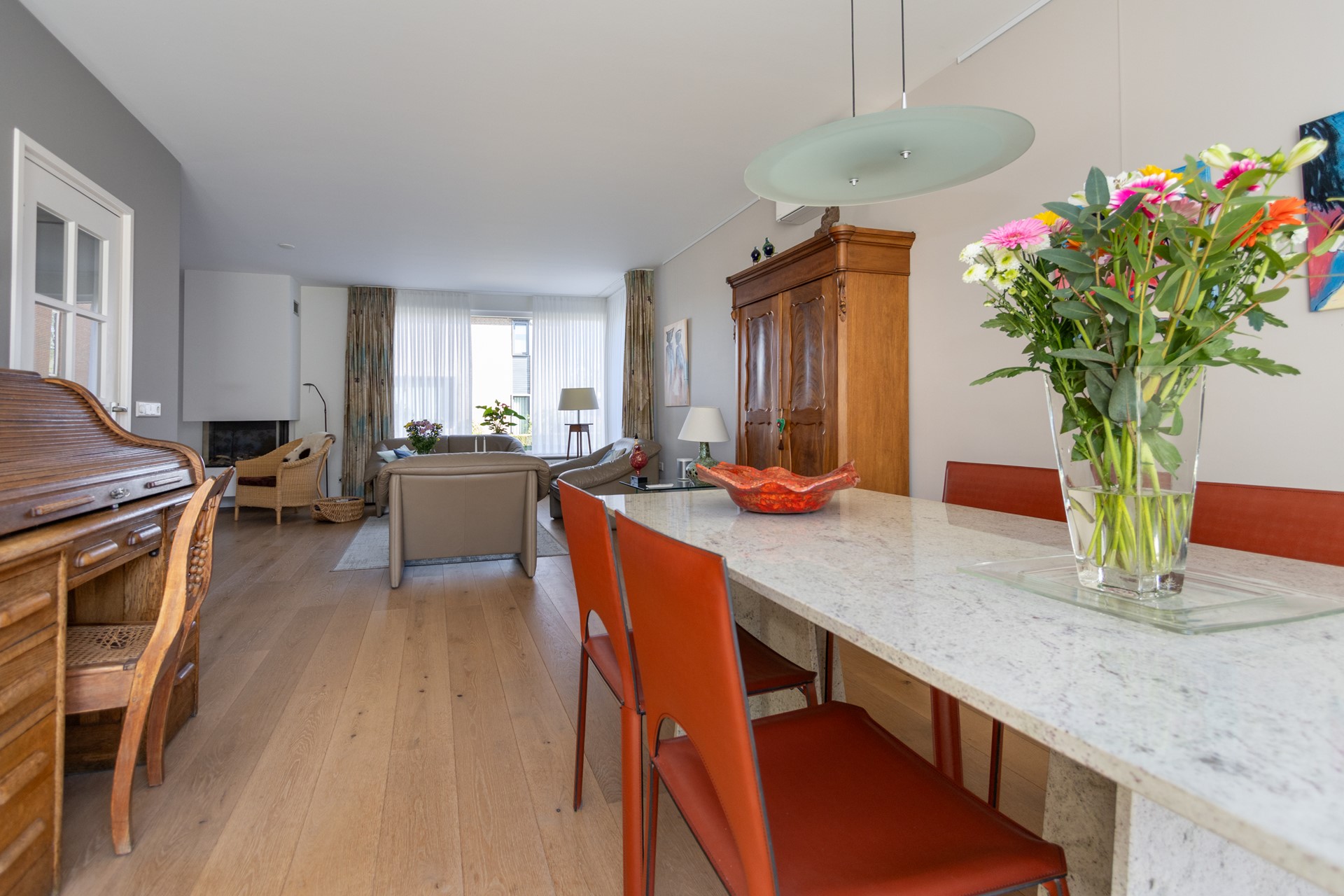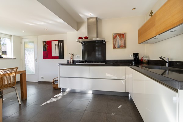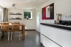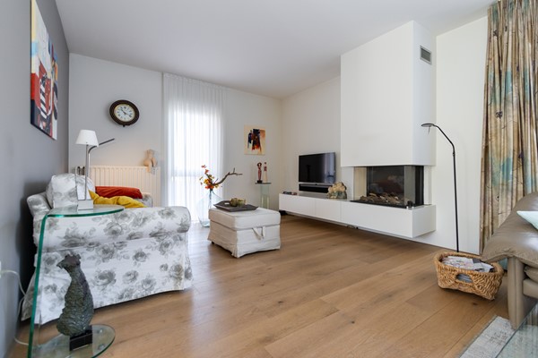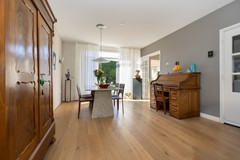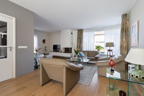 De L?vormige woonkamer is licht en ruim en beschikt over een inbouw gashaard van Faber, airco-unit en afsluitbare houten deuren met glas naar de keuken. Dankzij de grote raampartijen en de ligging op het zuiden geniet je hier van veel daglicht en een prettig uitzicht op de tuin.