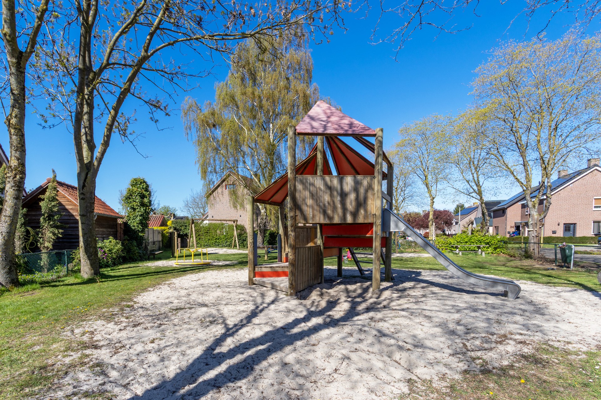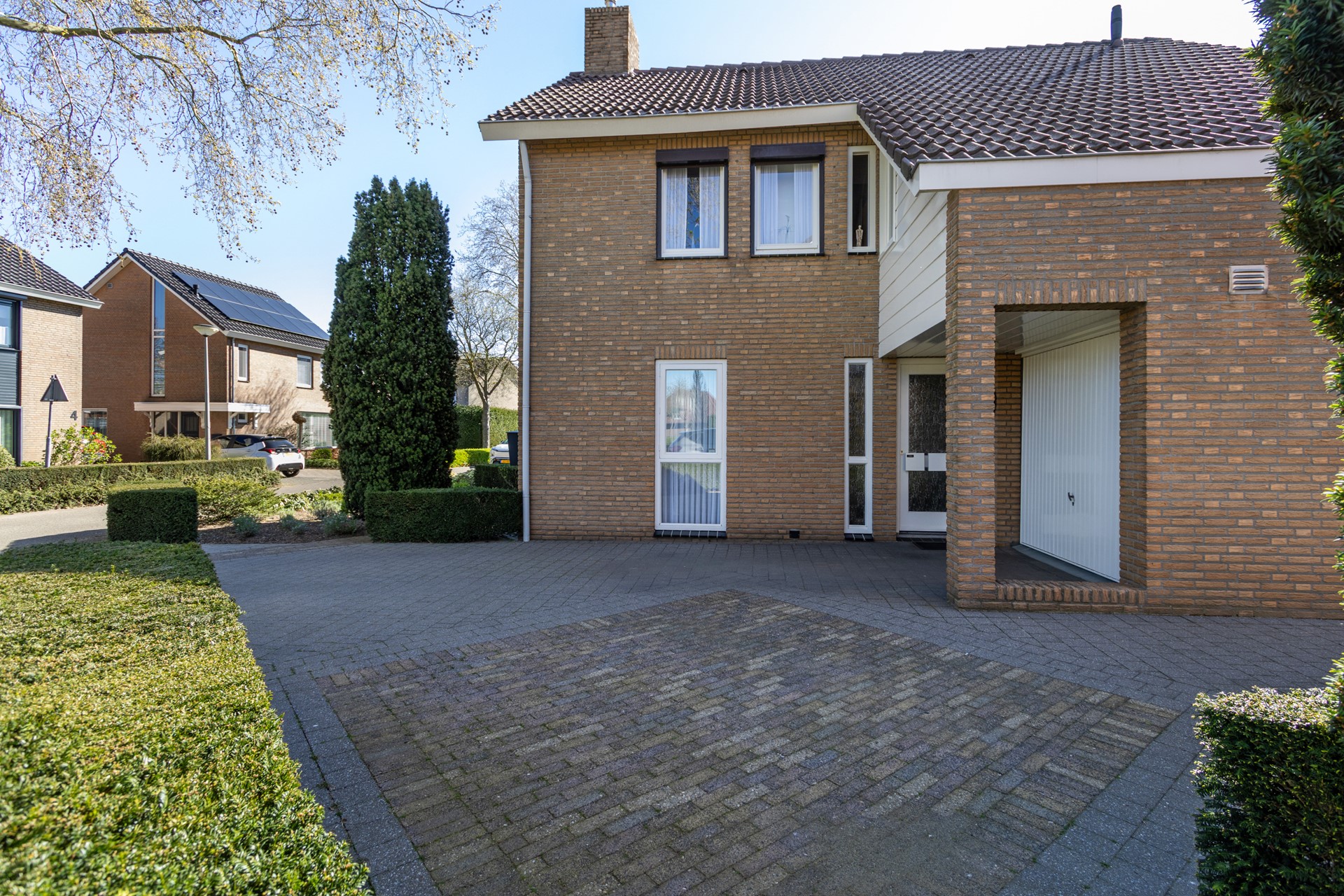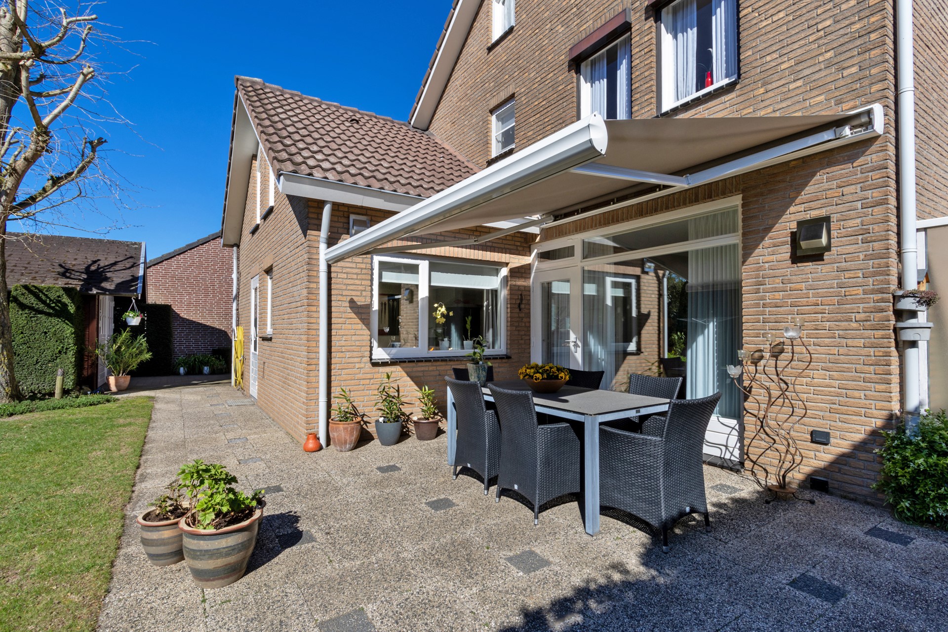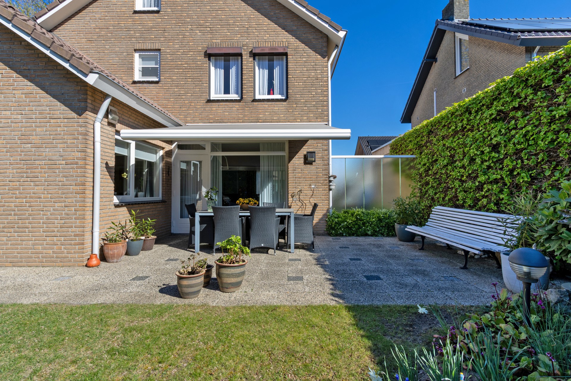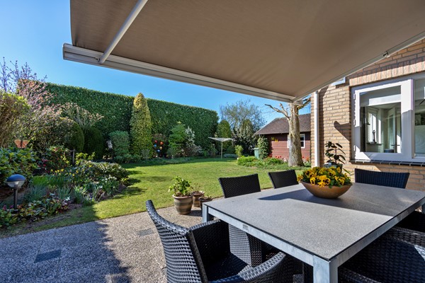 De groene tuin is op het zuiden georiënteerd en biedt een heerlijke plek om te ontspannen. Dankzij de vrije ligging en het vele groen geniet je hier van rust en privacy. De tuin is ruim opgezet en biedt mogelijkheden voor een terras, speelruimte of tuinliefhebberij. De woning is bovendien voorzien van een elektrisch bedienbare buitenzonwering, wat zorgt voor extra comfort tijdens warme dagen.