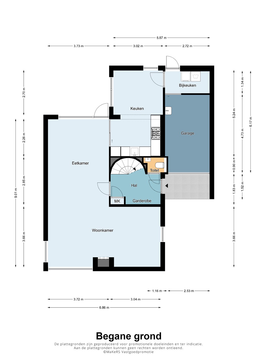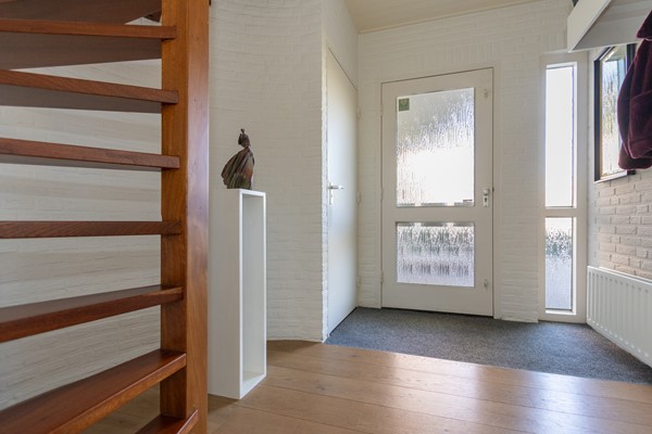 Je betreedt de woning via de hal, die toegang biedt tot de woonkamer, een apart toilet meterkast en houten wenteltrap.