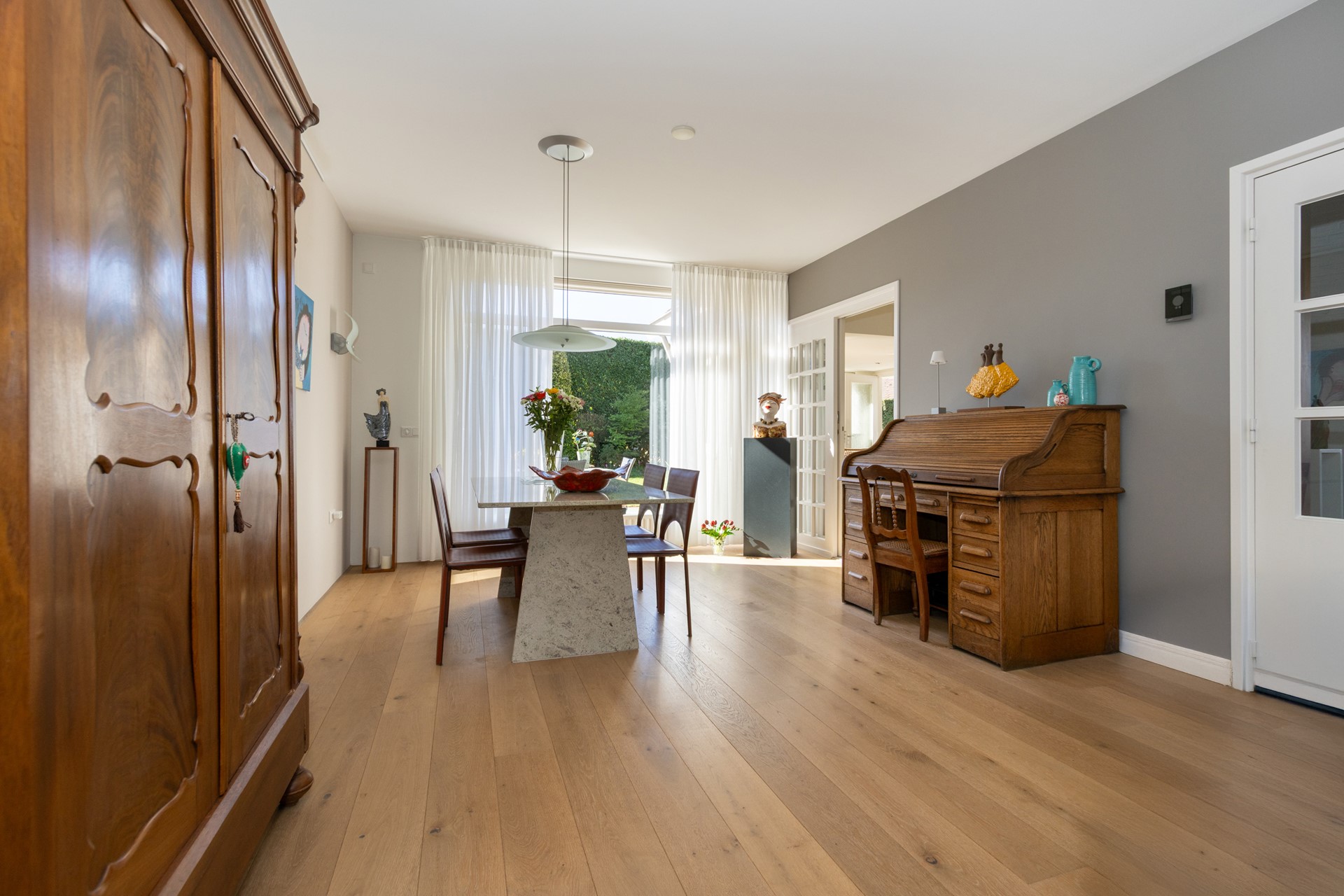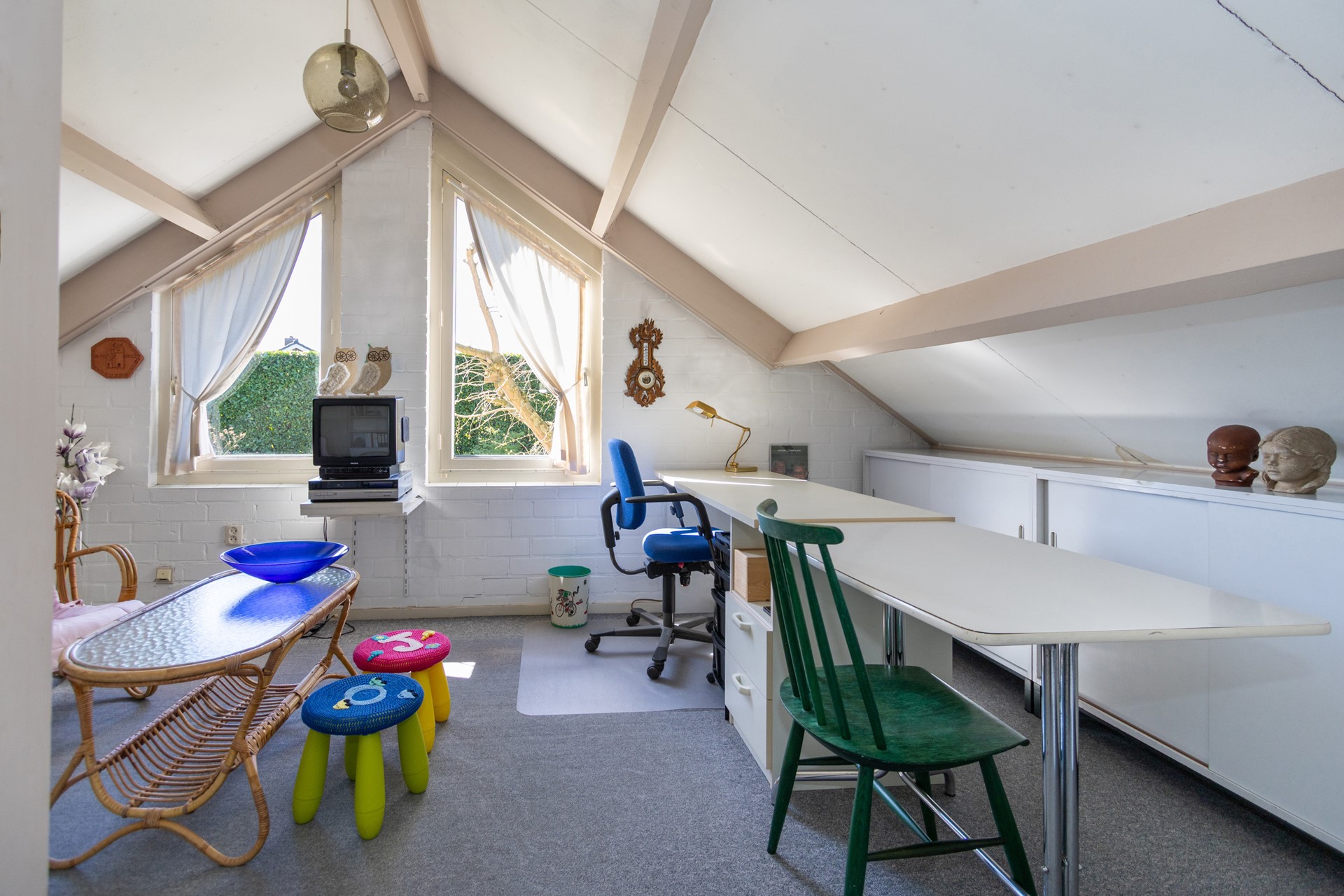 Daarnaast is er een extra grote (slaap)kamer aanwezig, die momenteel in gebruik is als werkkamer. Dankzij de royale afmetingen en bijzonder hoge nok biedt deze ruimte volop mogelijkheden voor uiteenlopende woonwensen.
