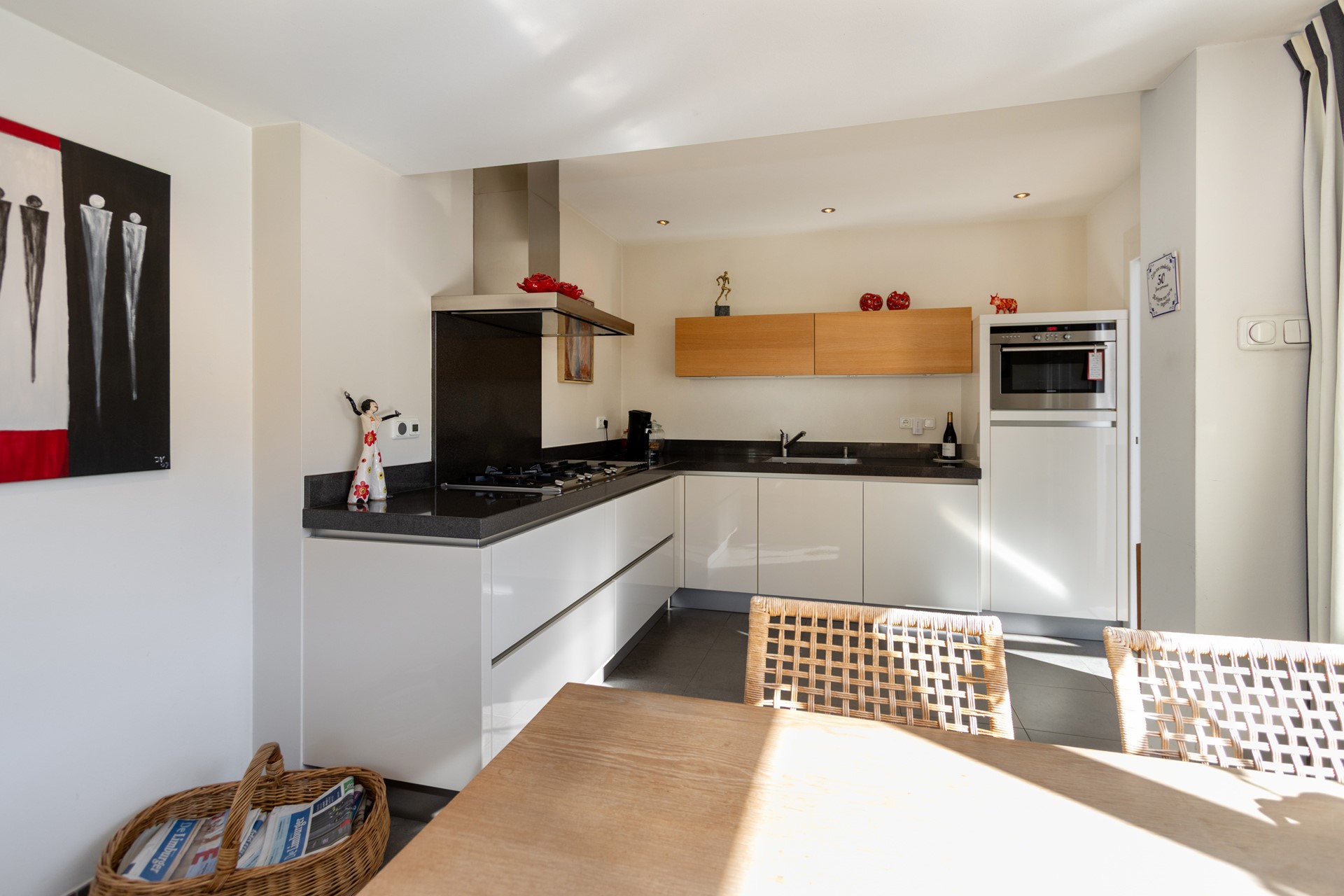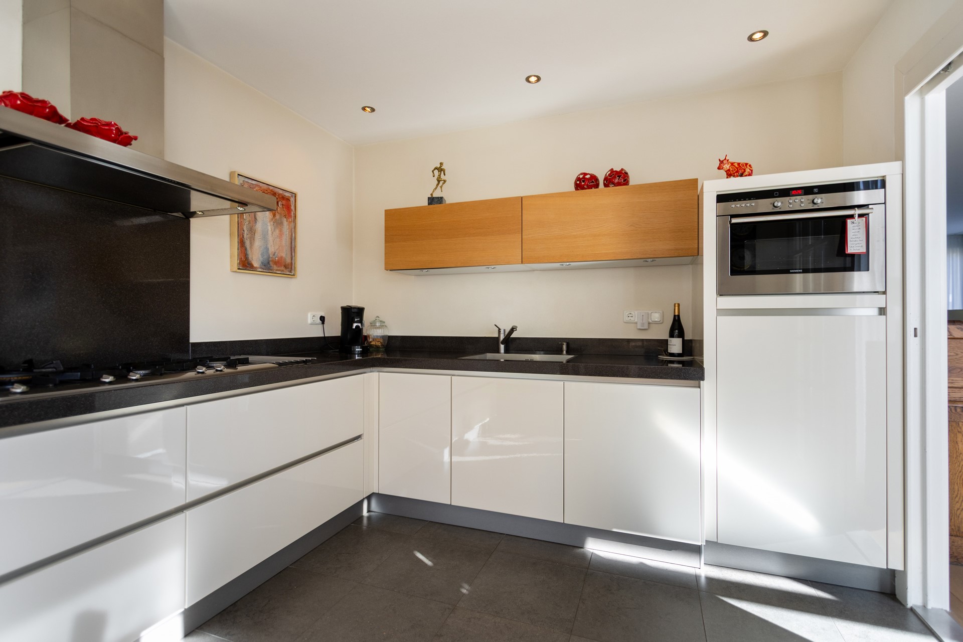 De moderne hoogglans hoekkeuken is uitgerust met diverse Siemens inbouwapparatuur, waaronder een 5-pits gasfornuis met wokbrander, afzuigkap, vaatwasser, combi-oven en koelkast. De keuken biedt voldoende werkruimte en plek voor een extra eethoek.