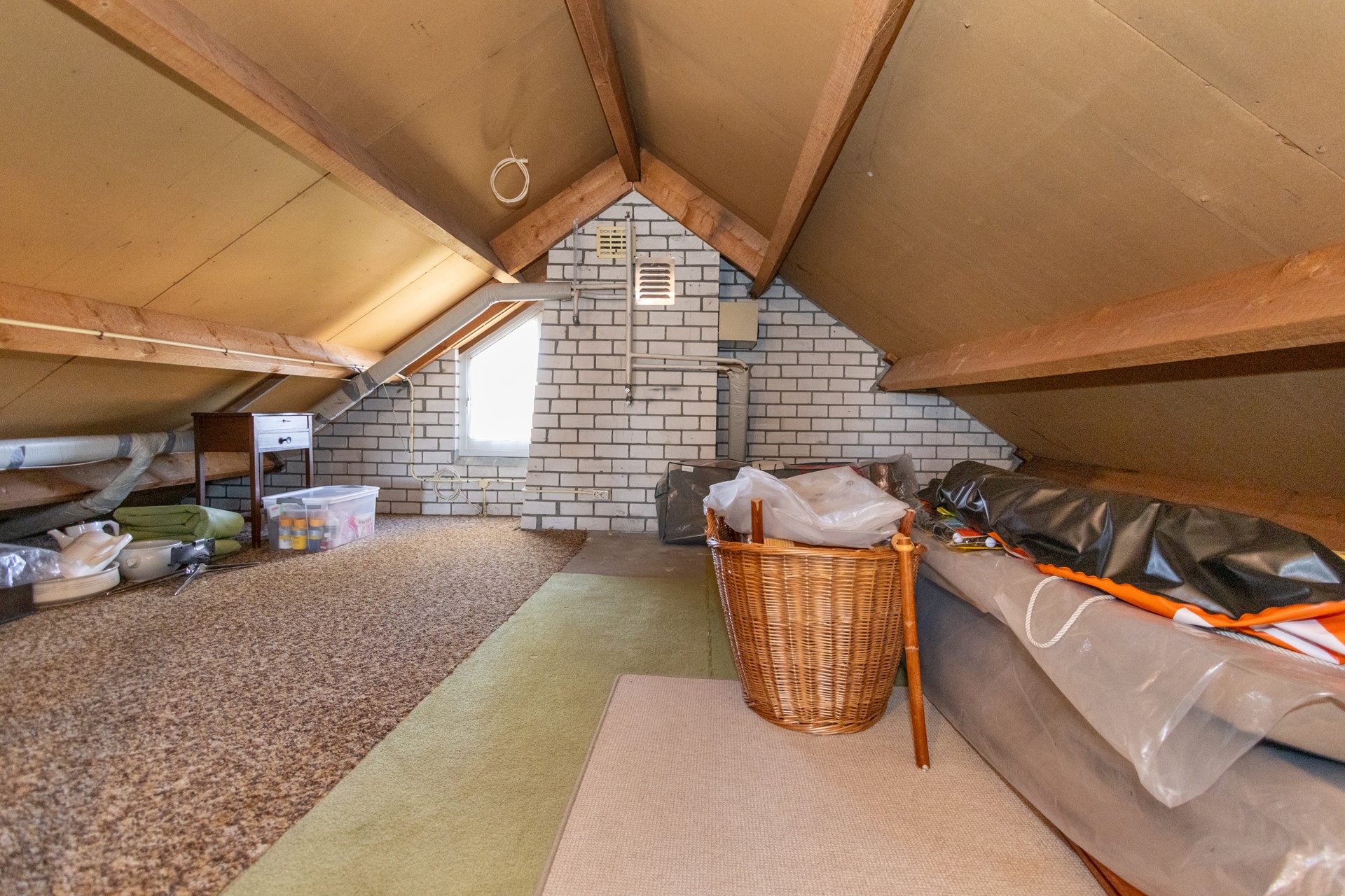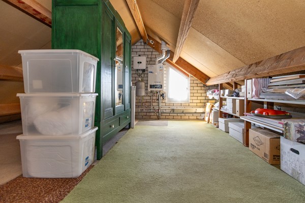 De woning heeft een royale bergzolder van ongeveer 25 m², waar je rechtop kunt staan en die bereikbaar is via een vlizotrap, perfect als extra opslagruimte. Ook bevindt zich hier de Nefit Trendline II HRC 30 ketel uit 2018 en de Huawei omvormer van de 12 zonnepanelen (405 Wp per stuk).