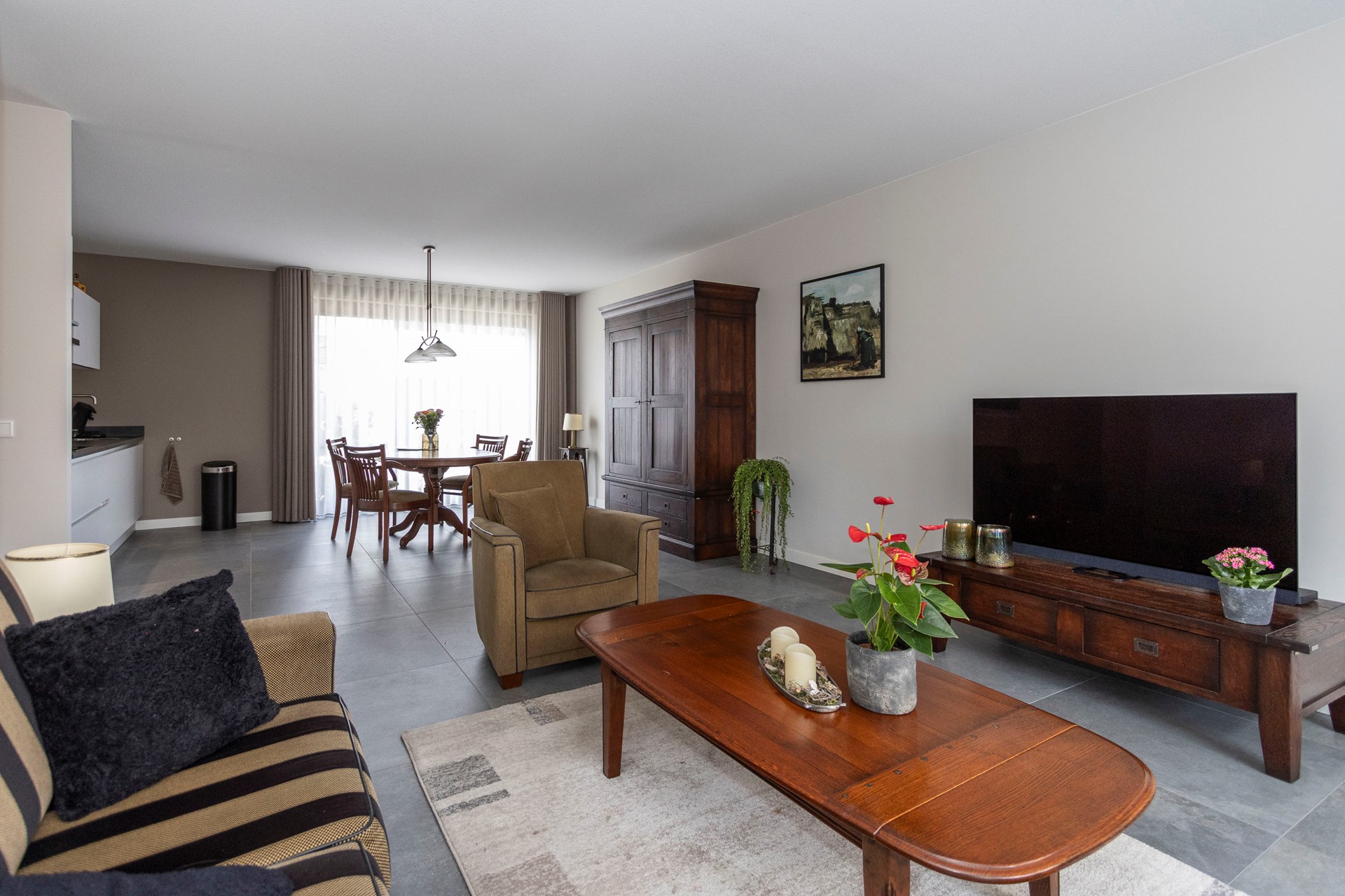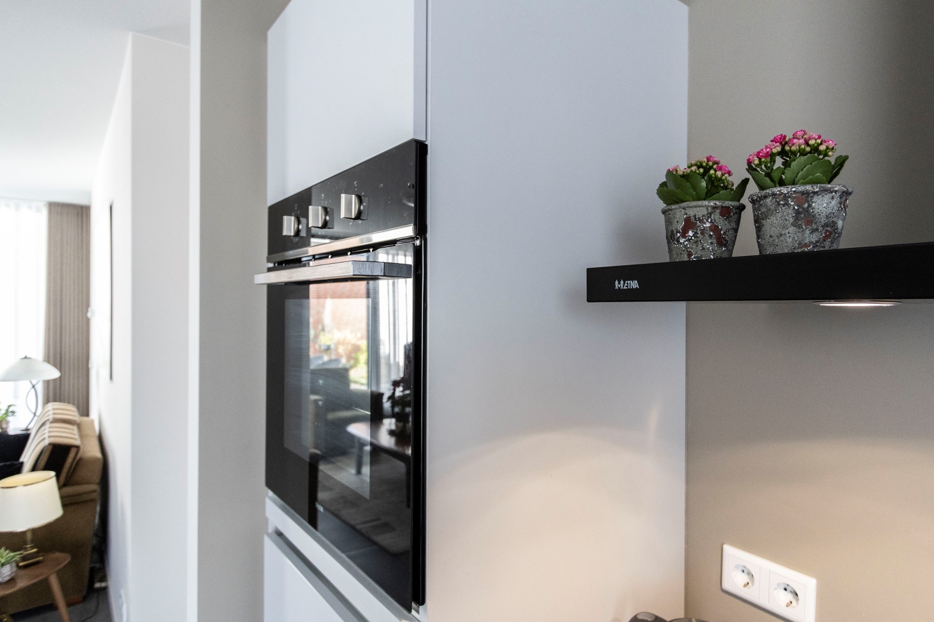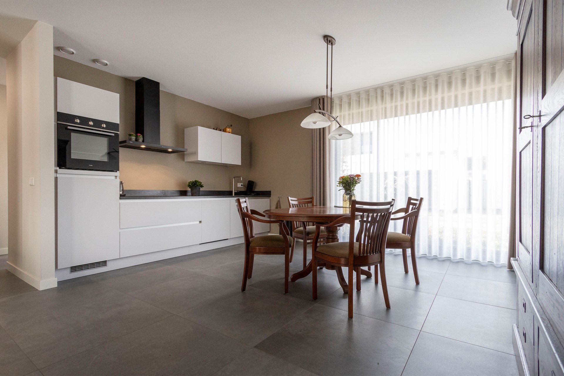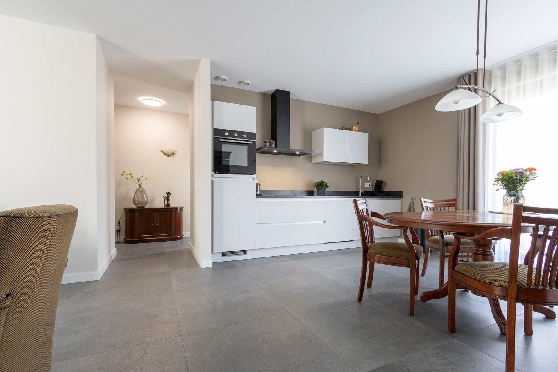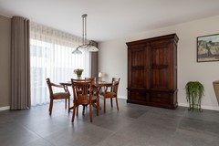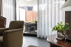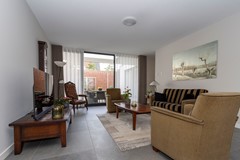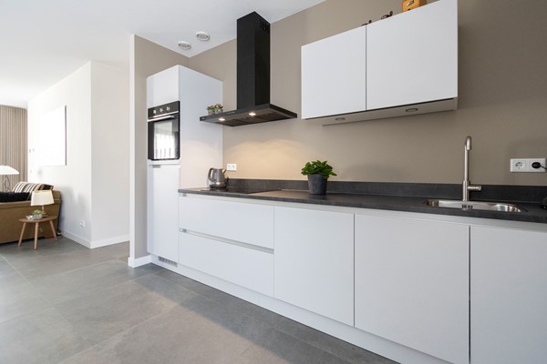 De doorzonwoonkamer is licht en ruim dankzij de grote raampartij aan de voorzijde en achterzijde en biedt volop ruimte voor een fijne zithoek. De open keuken sluit hier naadloos op aan en is uitgerust met diverse inbouwapparatuur, waaronder een inductiekookplaat, afzuigkap, vaatwasser, oven en koelkast. Een fijne, centrale plek in huis met veel licht en zicht op zowel de voor- als achtertuin.
