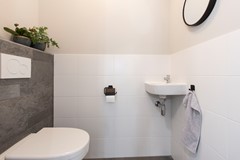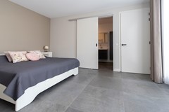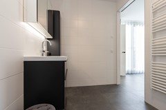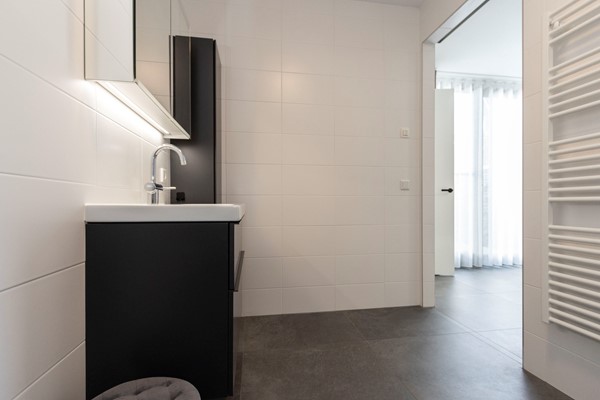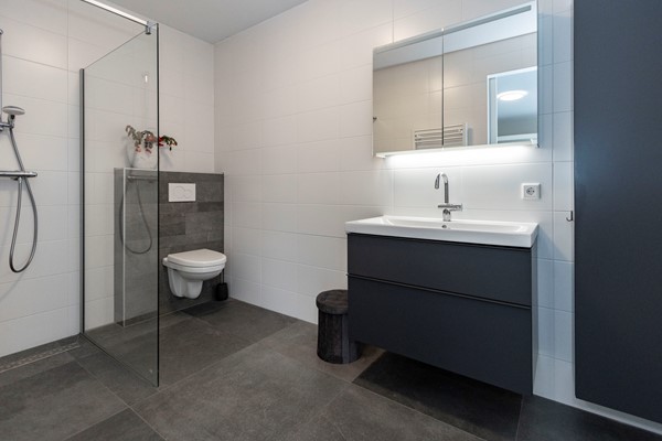 De slaapkamer op de begane grond is van fijn formaat en beschikt over een ensuite badkamer. Deze moderne badkamer is voorzien van een inloopdouche, toilet, wastafel met spiegel en verlichting, meubel, designradiator en mechanische afzuiging. Hiermee is de woning volledig levensloopbestendig ingericht.