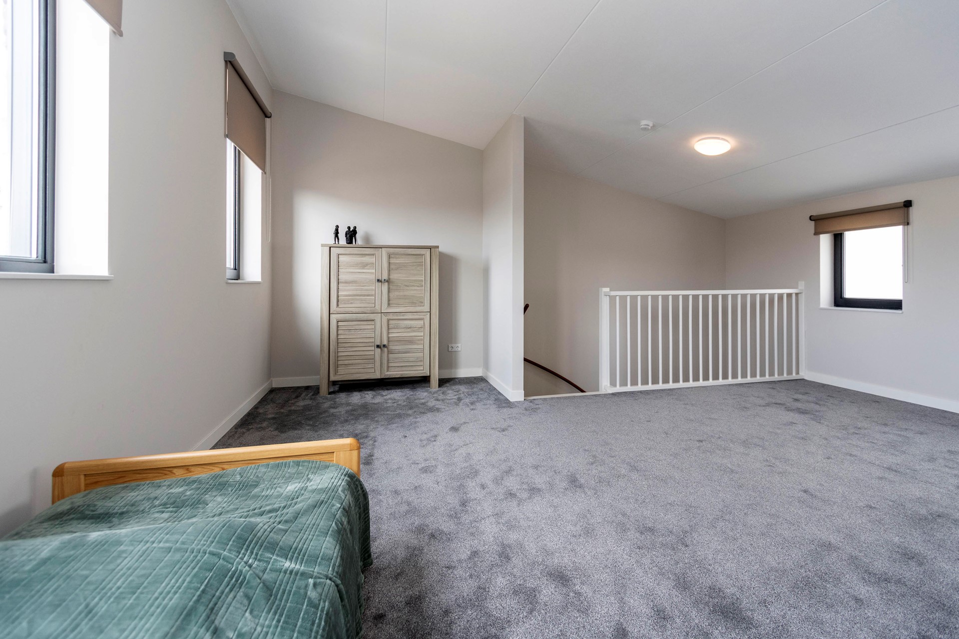 Op de eerste verdieping bevindt zich een ruime extra (slaap)kamer. Deze multifunctionele ruimte is ideaal als logeerkamer, hobbyruimte of thuiskantoor. Dankzij het lessenaarsdak en de royale afmetingen voelt deze verdieping verrassend ruim aan.