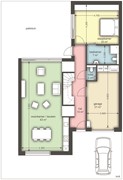 Via de oprit bereik je de entree van de woning. De ruime ontvangsthal is praktisch ingedeeld en biedt toegang tot de woonkamer, keuken, slaapkamer, badkamer, apart toilet en inpandige garage.