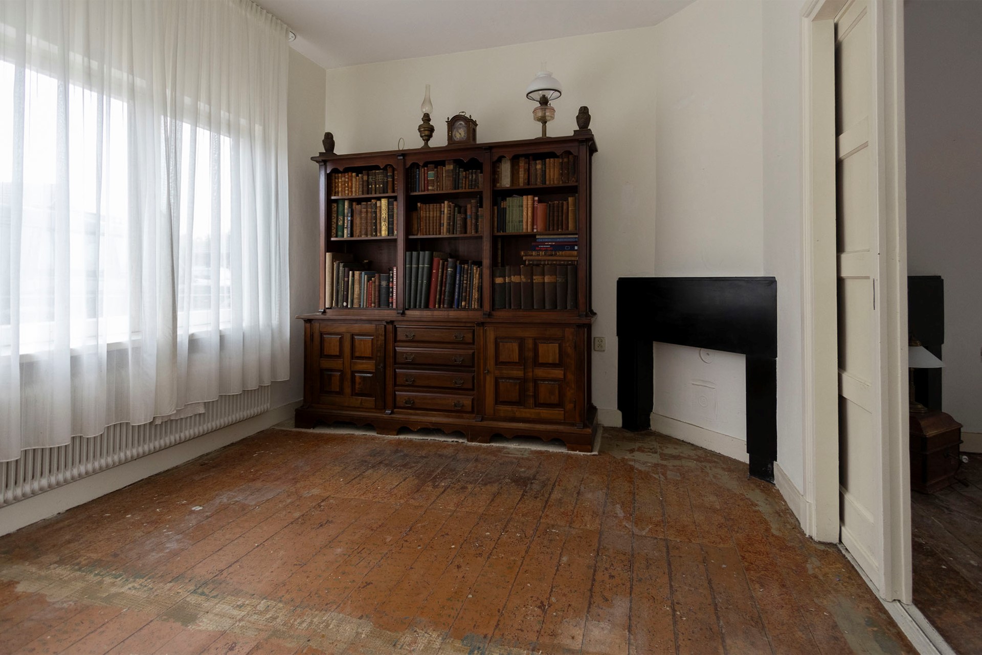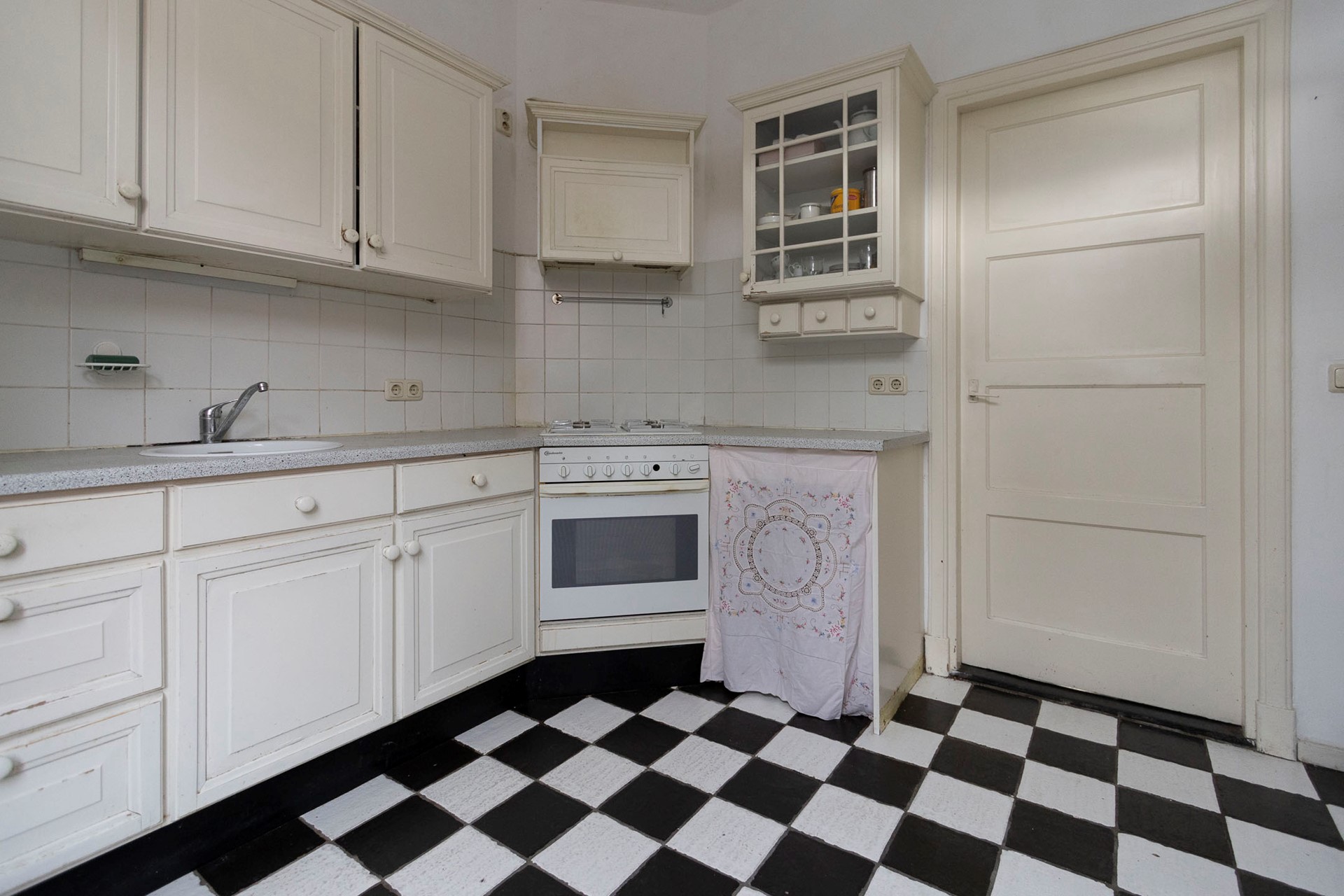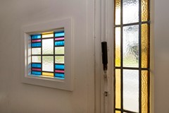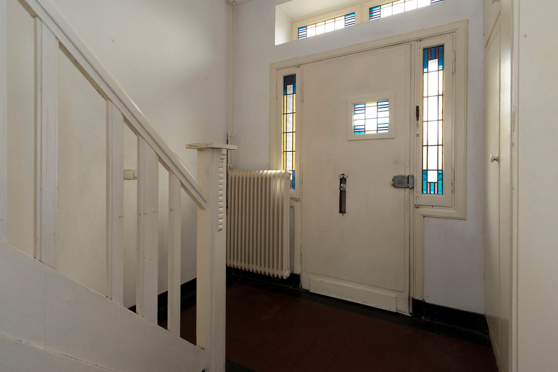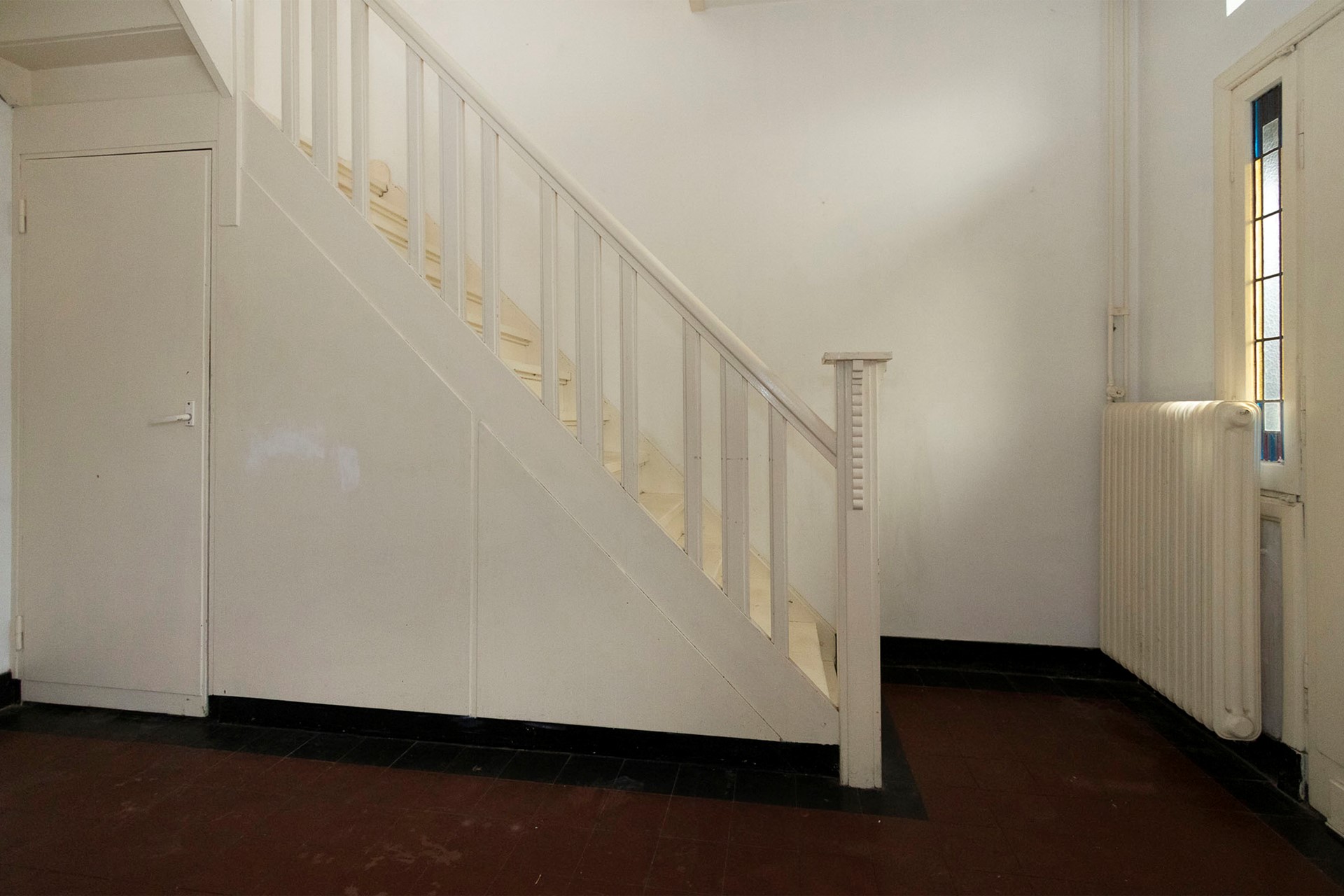 Bij binnenkomst valt direct het glas-in-loodraam bij de entree op, een sfeervol detail dat herinnert aan het bouwjaar van de woning. De hal biedt toegang tot de woonkamer en suite, waar de originele indeling nog intact is. De voorkamer kijkt uit over de straat, terwijl de achterkamer zicht biedt op de diepe tuin. De ruimtes zijn licht en ruim, met volop mogelijkheden om te moderniseren en te herindelen.