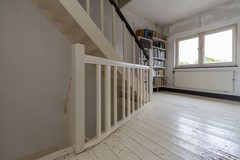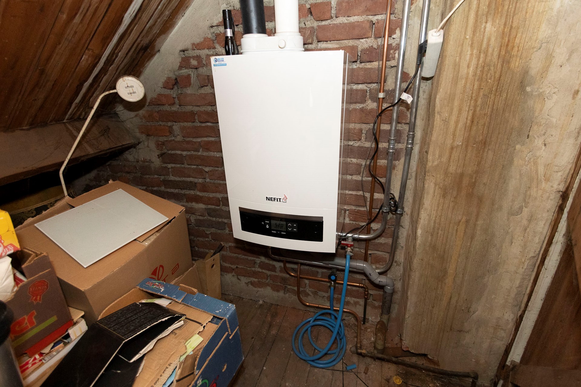 Op de eerste verdieping bevinden zich twee slaapkamers en een ruime badkamer, compleet met douche, ligbad, dubbele wastafel, meubel en hang toilet. De achterste slaapkamer is voorzien van een praktische muurkast en biedt uitzicht op het diepe perceel. Via een vaste trap is de zolderverdieping bereikbaar, waar een derde slaapkamer gerealiseerd kan worden. Deze ruimte biedt ook volop mogelijkheden voor uitbreiding of het creëren van een hobbykamer, thuiskantoor of logeerruimte. Hier is tevens de Nefit Trendline HR-ketel uit 2017 geïnstalleerd.
