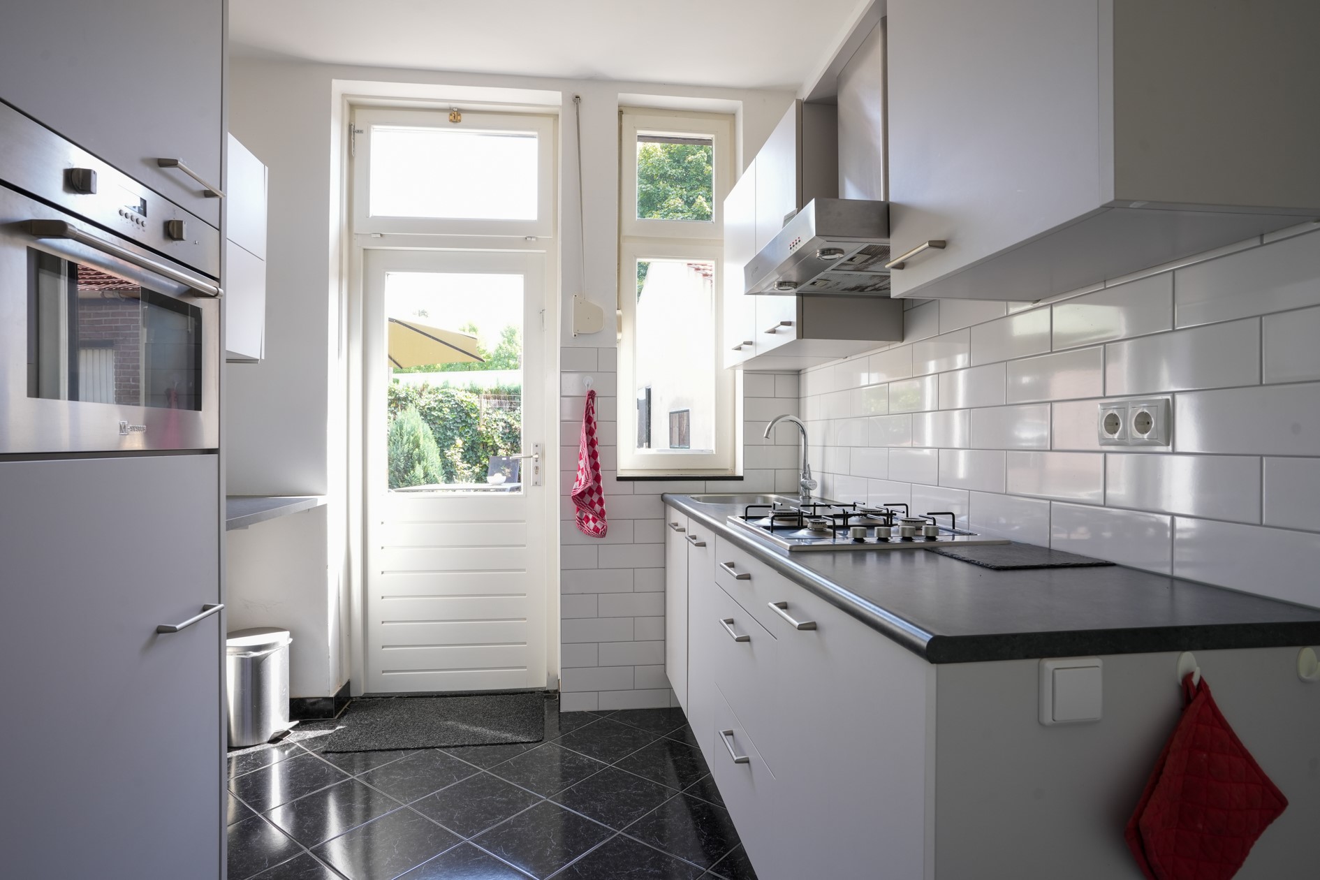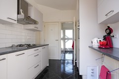 Gesloten keuken voorzien tegelvloer, enkele deur naar de tuin. Aanbouwinstallatie met de volgende inbouwapparatuur: 4-pits gaskookplaat, koelkast, oven, vaatwasser, RVS-afzuiging