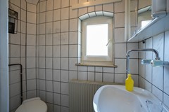 Volledig betegeld toilet voorzien van staand toilet (sanibroyeur) en wastafel