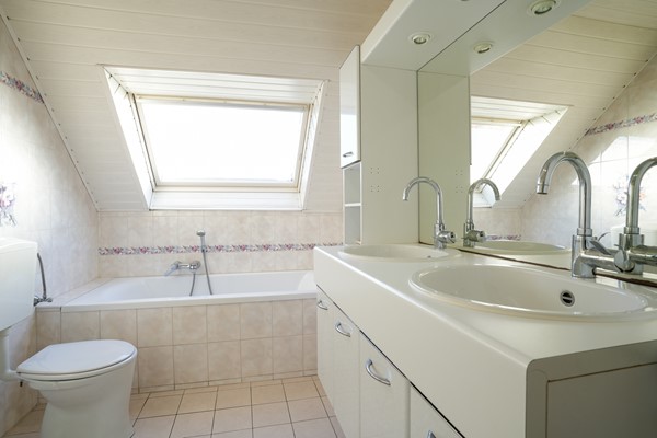 Badkamer voorzien van ligbad, dubbele wastafel, douche en toilet met staand closet