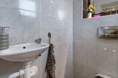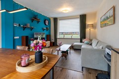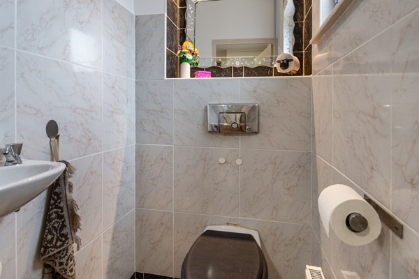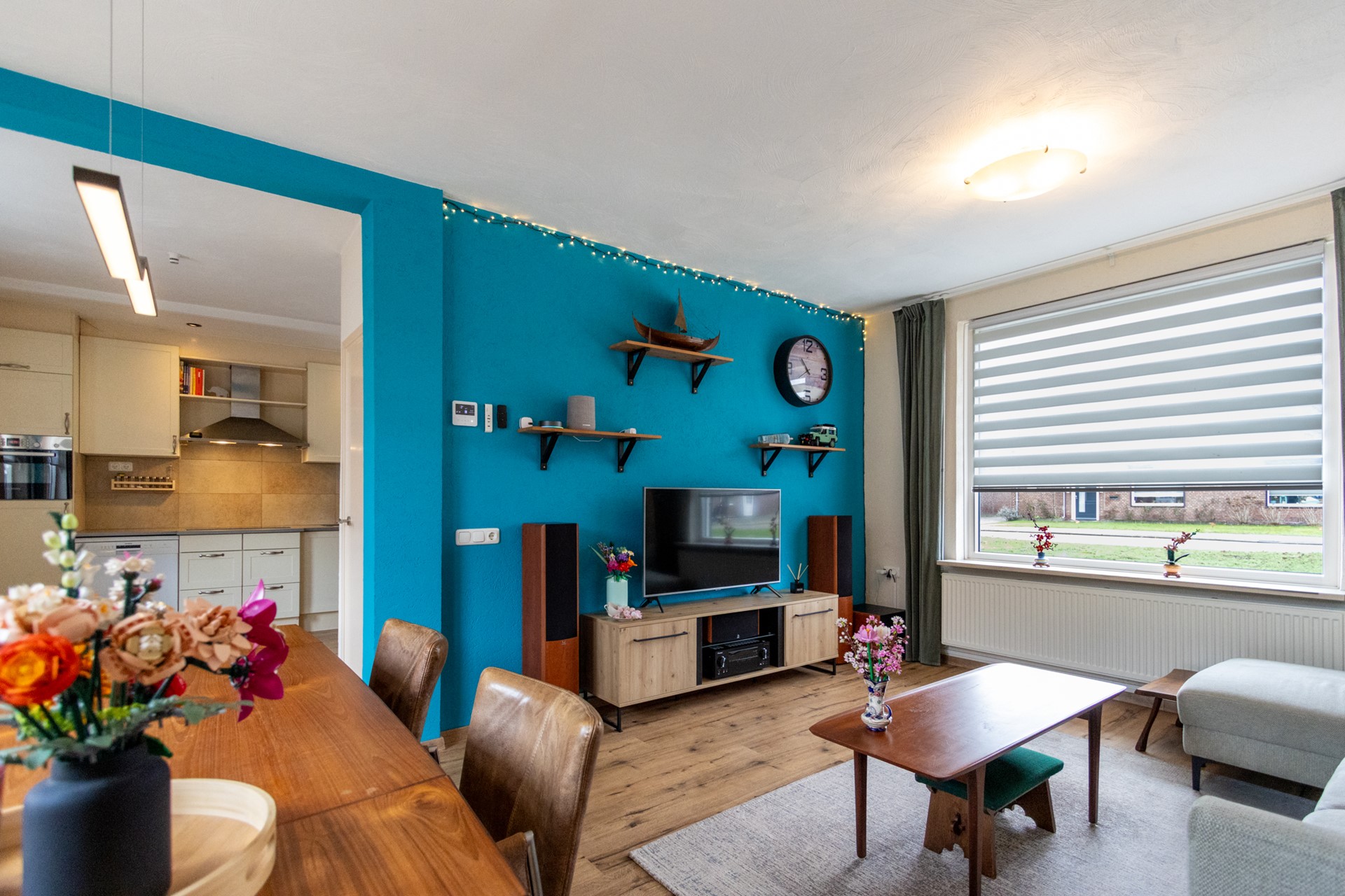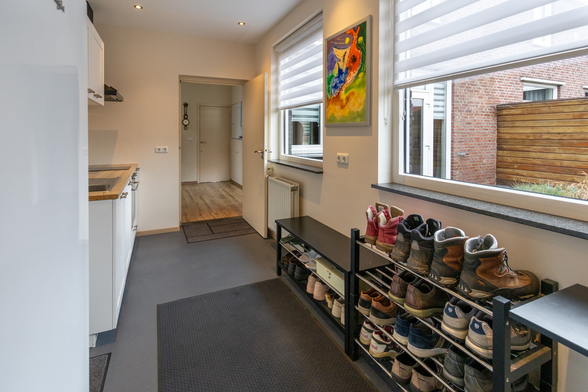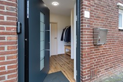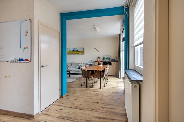 Dankzij de ligging achter de groene middenberm, ligt de woning een prettig stuk van de weg af. Entree via de voordeur aan de voorzijde van de woning. In de hal bevinden zich de uitgebreide meterkast, het toilet met fontein en de trap naar de eerste verdieping. Vanuit de hal bereik je de lichte woonkamer, die dankzij de grote raampartijen een prettige hoeveelheid daglicht binnenlaat. De woonkamer is voorzien van een airco, wat zorgt voor extra comfort in alle seizoenen. Via een tuindeur stap je hier zo de achtertuin in.