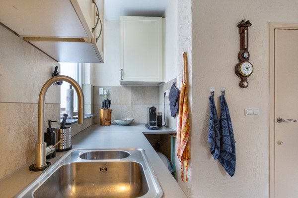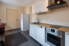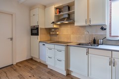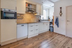 Aangrenzend bevindt zich de open keuken, voorzien van een dubbele spoelbak en diverse inbouwapparaten zoals een inductie kookplaat, afzuigkap, vaatwasser, combi-oven en koelkast. Vanuit de keuken is er toegang tot de ruime bijkeuken, uitgerust met een extra keukenblok, spoelbak, elektrische kookplaat, afzuigkap, oven en extra kastruimte. Ook zijn hier extra witgoedaansluitingen te vinden. De bijkeuken biedt toegang tot de achtertuin, garage en carport.