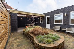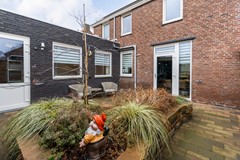 De achtertuin is verzorgd en onderhoudsvriendelijk aangelegd. Dankzij de overkapping met twee lichtkoepels en extra opbergruimte geniet je hier optimaal van het buitenleven. De tuin biedt veel privacy en heeft een speelse uitstraling door de groene beplanting in het midden.