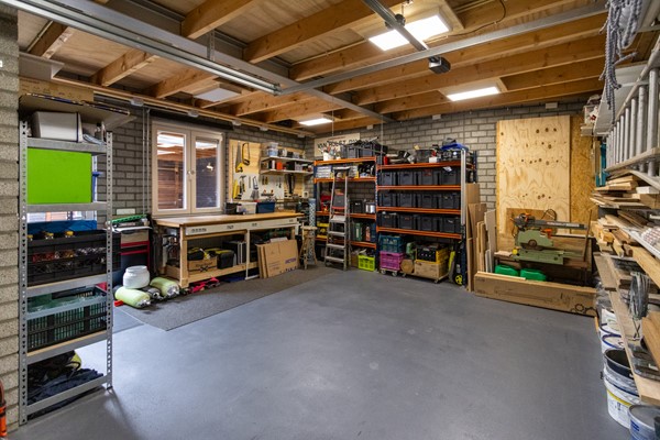 De garage is royaal van formaat en volledig geïsoleerd. Dankzij de elektrische rolpoort, verwarming en elektra is deze ruimte ideaal voor het stallen van een auto, het inrichten van een hobby-/praktijkruimte, extra opslag of het creëren van een levensloopbestendige woonruimte.