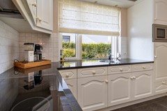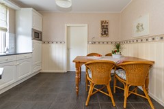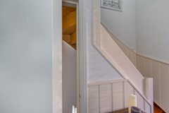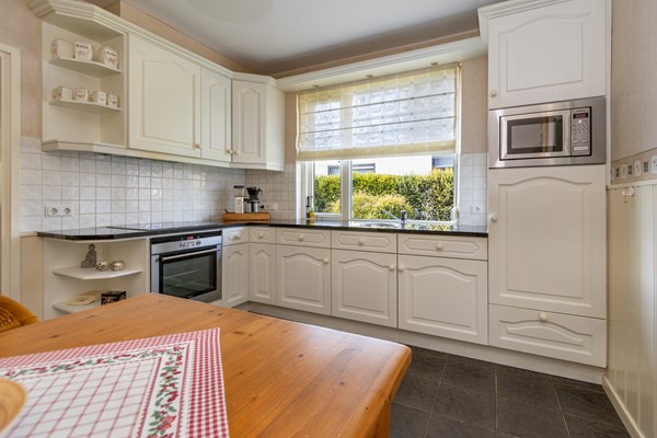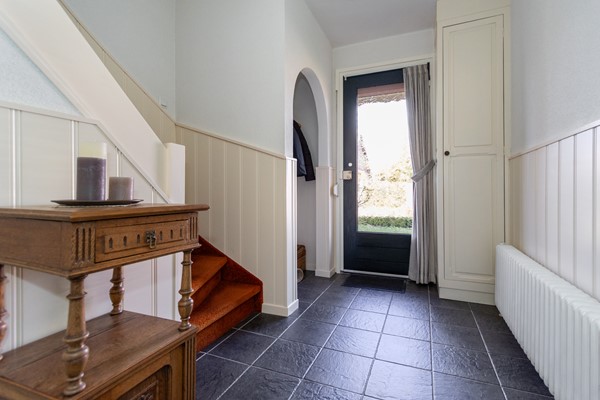 Bij binnenkomst via de voordeur stap je de ontvangsthal binnen. Hier vind je de meterkast, de trap naar de eerste verdieping, toegang tot de kelder en de doorgang naar de keuken. De keuken is uitgevoerd in een nette witte L opstelling met granieten werkblad en voorzien van een koelkast, magnetron, oven, keramische kookplaat, afzuigkap en vaatwasser. Vanuit de keuken is er toegang tot zowel de woonkamer als de bijkeuken. De woonkamer is een fijne, lichte leefruimte met een echte houten vloer en een karakteristieke oude schouw die direct sfeer geeft. In de bijkeuken bevinden zich het toilet, de witgoedaansluitingen en de cv ketel. Vanuit hier loop je door naar de serre: een heerlijke plek om te zitten, met uitzicht op de diepe en prachtig aangelegde tuin.