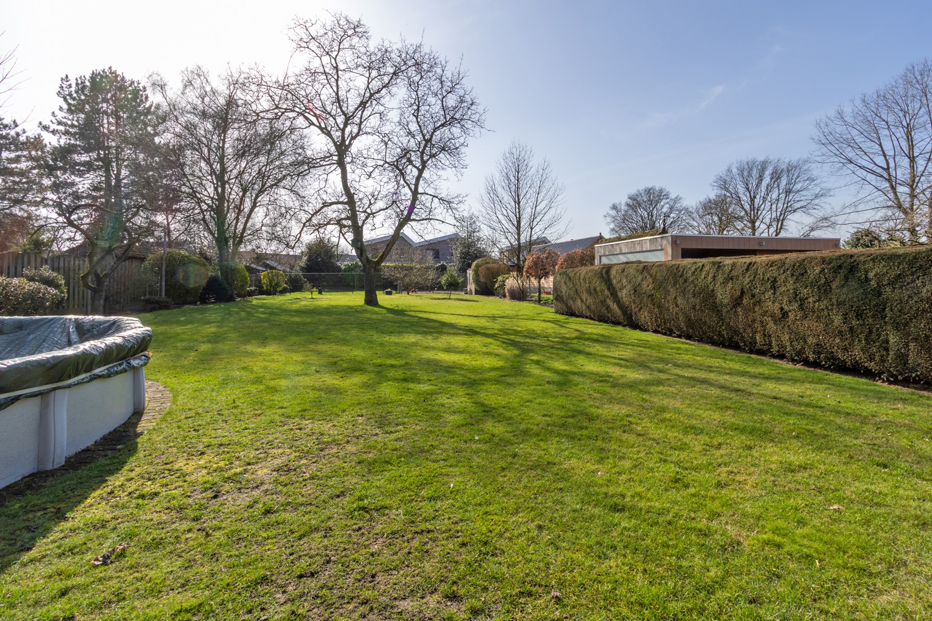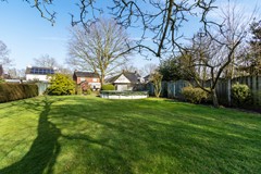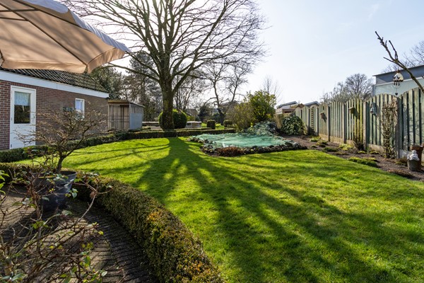 De tuin is een waar hoogtepunt: diep, groen, prachtig aangelegd en met volop privacy. Verderop in de tuin ligt een rond zwembad. Aan de woning vast bevinden zich een garage en twee schuren, die allen een eigen ingang hebben. Bij de achterste schuur is via buiten een bergzolder bereikbaar, die zich uitstrekt over de volledige diepte van het bijgebouw, perfect voor bergruimte.