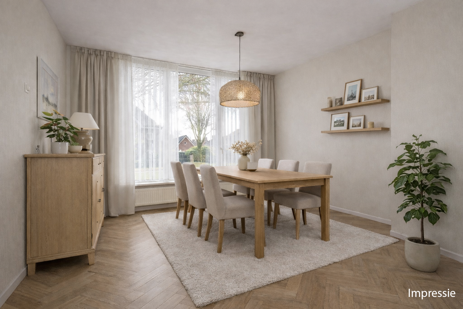 De woonkamer is licht en ruim dankzij de grote raampartij aan de voorkant. Deze ruimte biedt volop mogelijkheden voor een comfortabele zithoek en een royale eethoek. Aansluitend bevindt zich de grote keuken, die uitzicht biedt op de tuin. De keuken is voorzien van diverse inbouwapparatuur zoals een 4-pits gasfornuis, afzuigkap, vaatwasser, combi-oven en koelkast. De naastgelegen bijkeuken is praktisch ingedeeld en beschikt over witgoedaansluitingen, wastafel en tuindeur met rolluik.