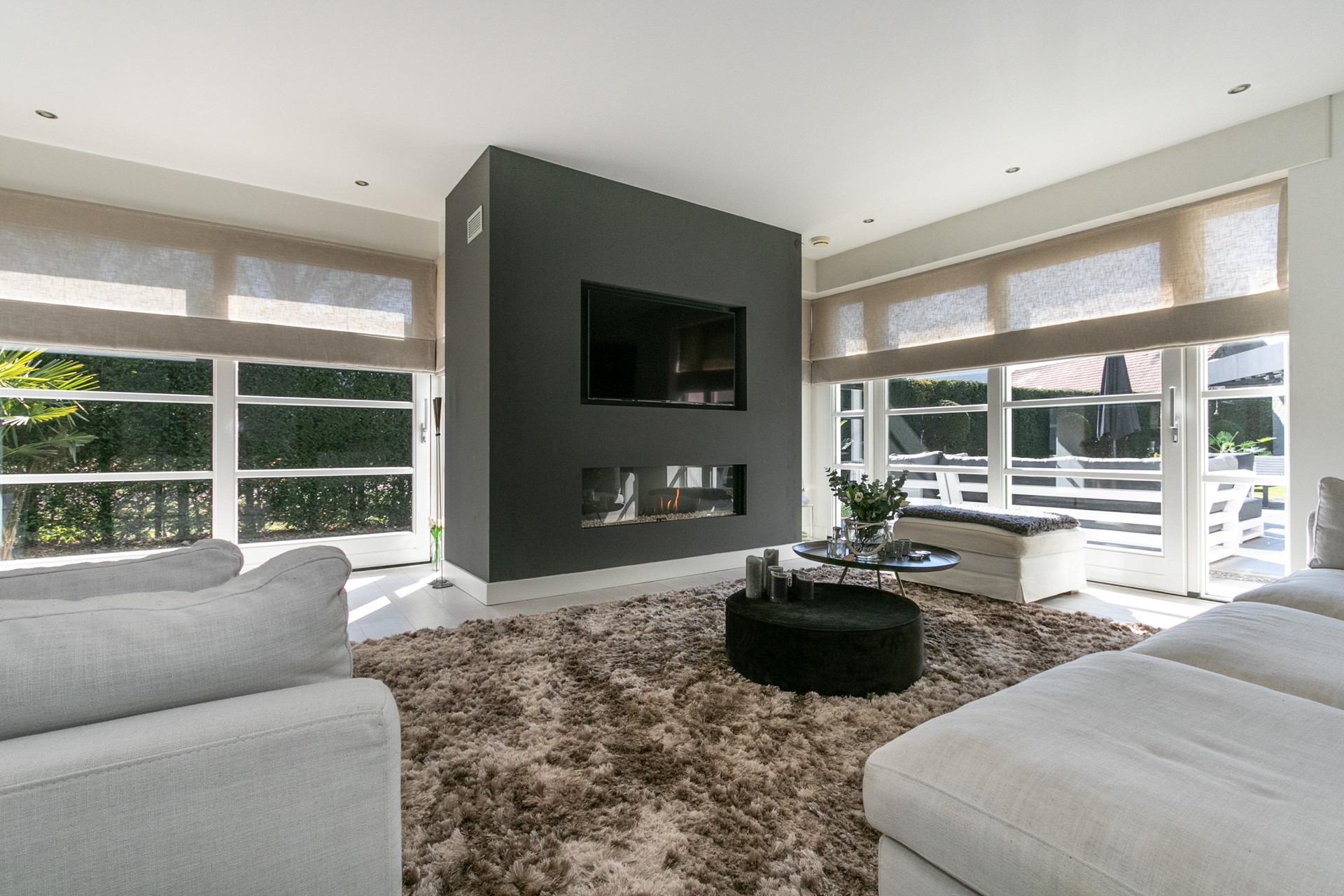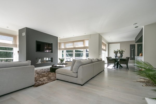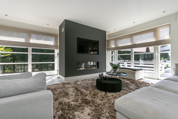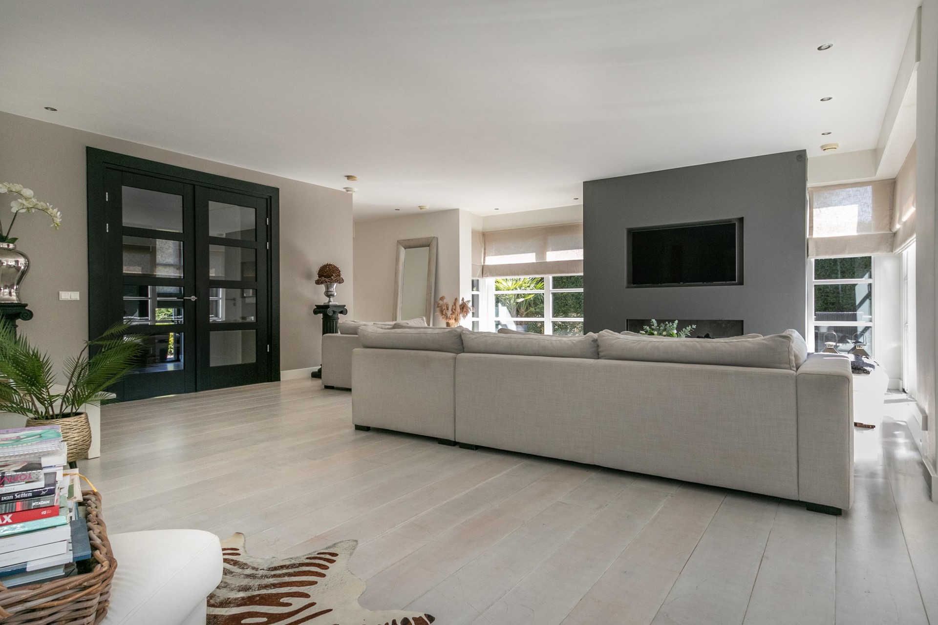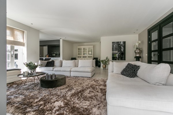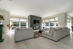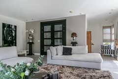 Dubbele glazen deuren geven toegang tot de ruime woonkamer met erker en grote raampartijen aan de zuidzijde, waardoor de leefruimte baadt in natuurlijk licht en een warme sfeer uitstraalt.