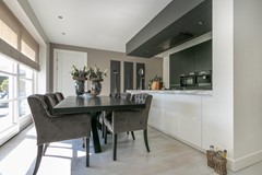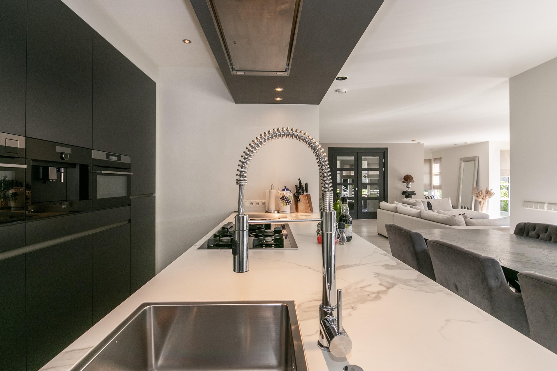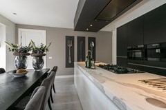 Aansluitend bevindt zich de open keuken met royaal werkblad en een matzwarte achterwand voorzien van diverse inbouwapparatuur. De keuken is greeploos uitgevoerd in hoogglans witte fronten, met een licht geaderd hardstenen werkblad, vlak ingebouwde rvs-spoelbak en een gas-op-glas kookplaat met wokbrander. De keuken is compleet uitgerust met combi-oven, magnetron, koffiezetapparaat, koel- en vrieskast, vaatwasser en een afzuigkap geïntegreerd in de bovenkoof.