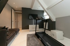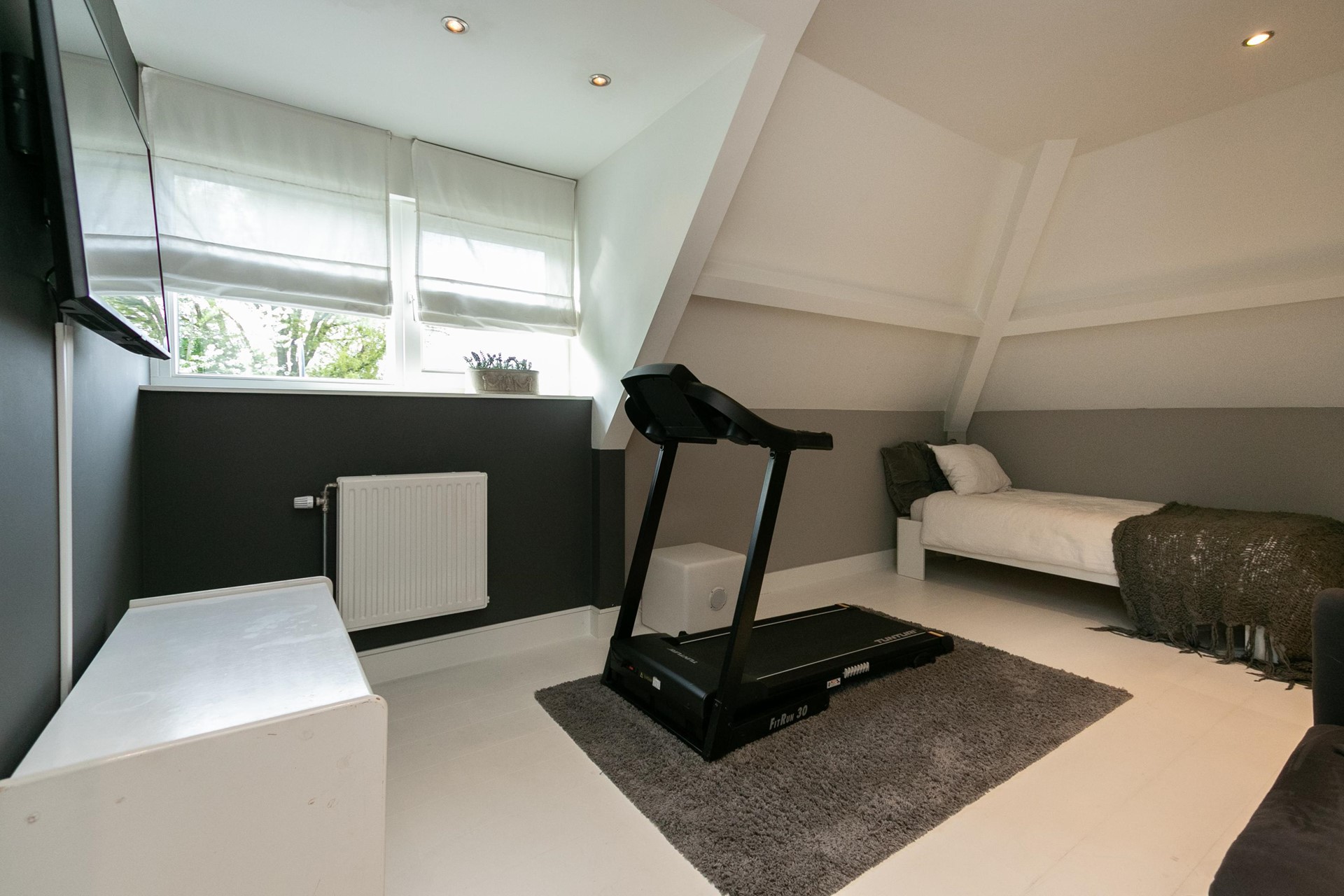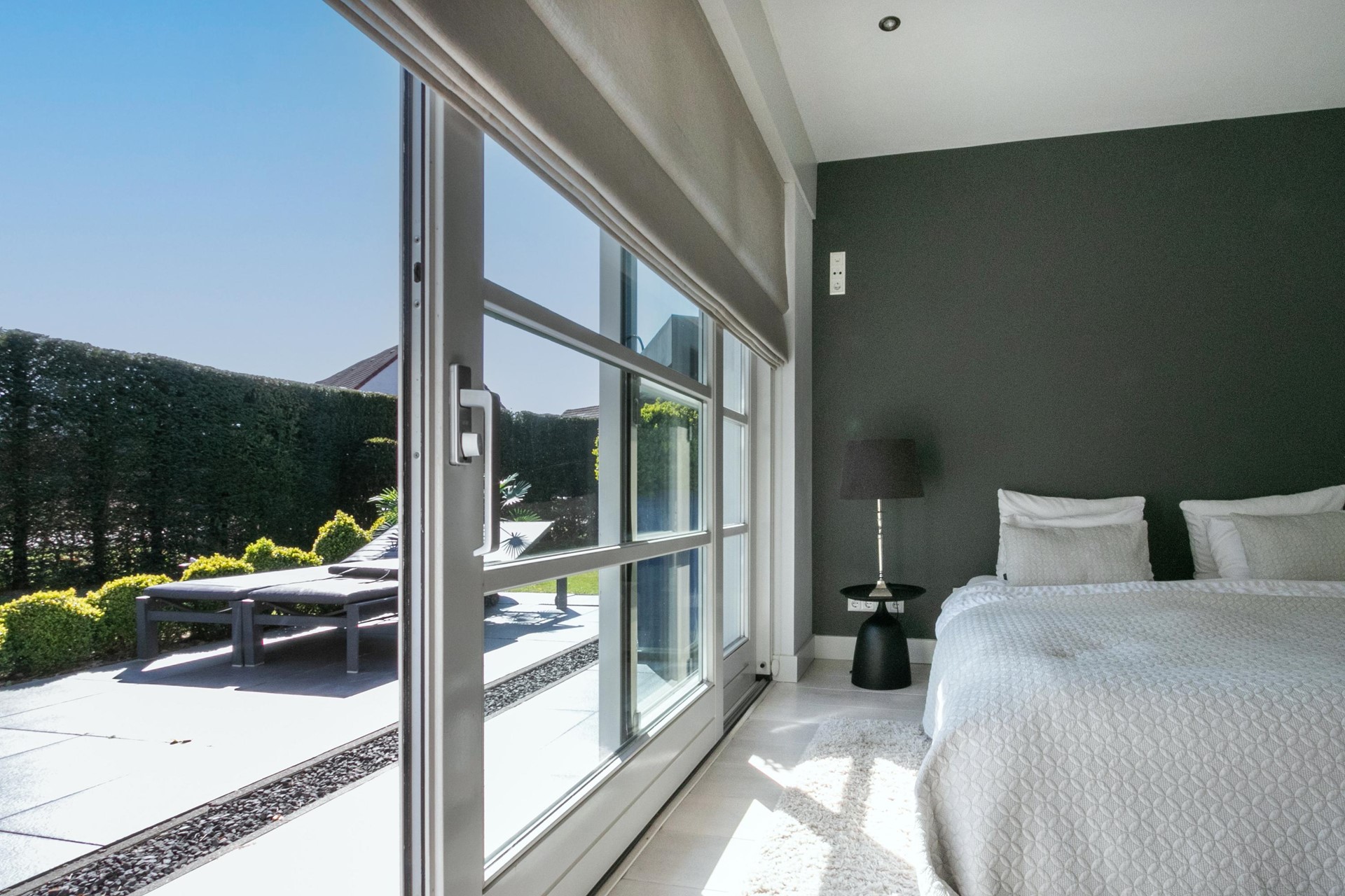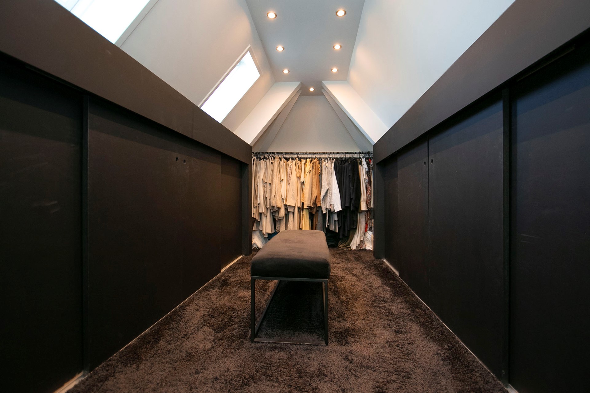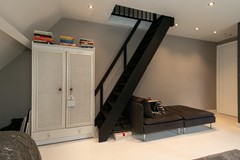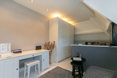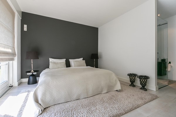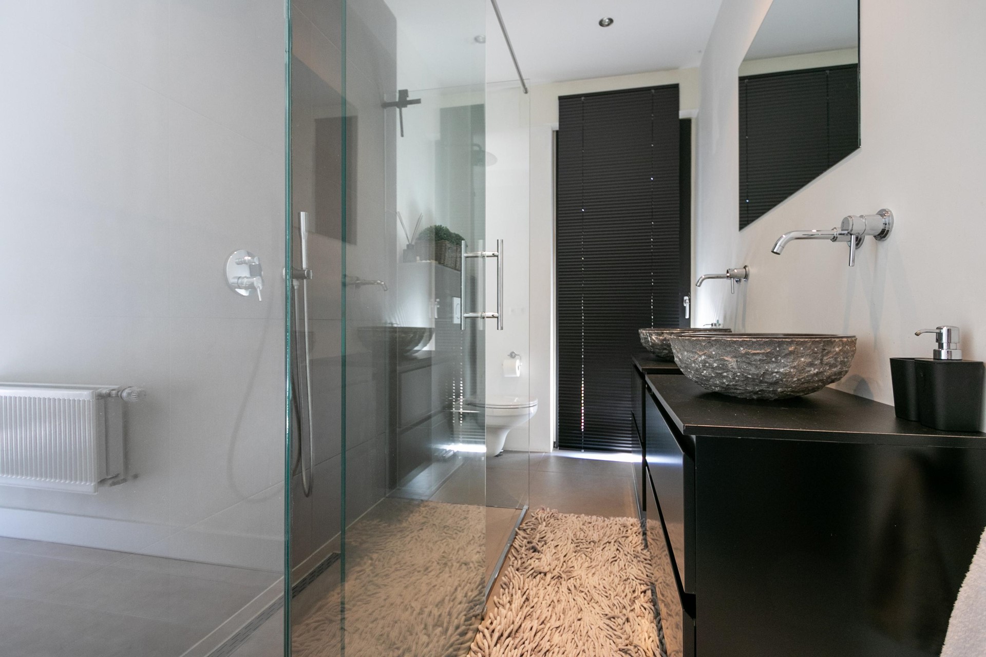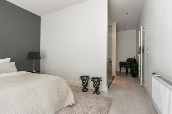 Grenzend aan de keuken is een riante slaapkamer gesitueerd, met ensuite badkamer voorzien van inloopdouche met regendouche, wandcloset en dubbele wastafel met meubel. De afwerking is stijlvol, grijze tegels gecombineerd met strak wit stucwerk. Naast de badkamer bevindt zich een extra bergruimte met trap naar een bovenliggende kleedkamer, uitgerust met schuifwandkasten.
