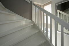 De begane grond is grotendeels afgewerkt met een moderne multiplankvloer in white-wash tint. Wanden en plafonds zijn strak wit gestuct, wat zorgt voor een rustige en ruimtelijke uitstraling.