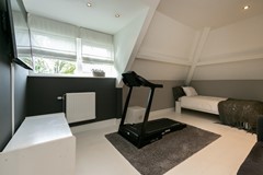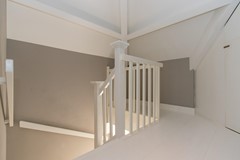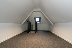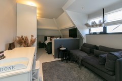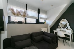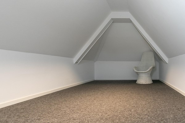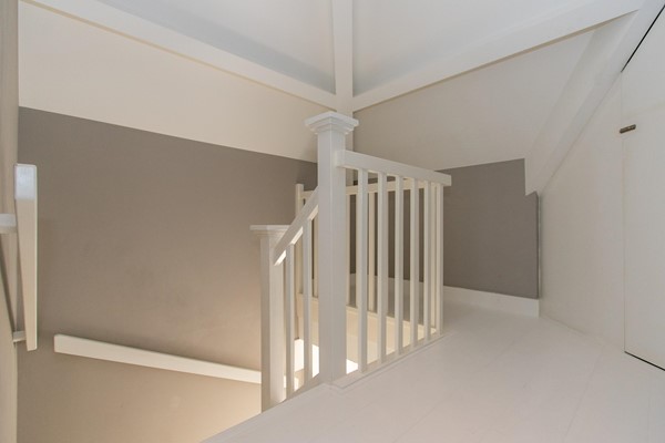De overloop en twee ruime slaapkamers zijn afgewerkt met een moderne gebroken witte vloer, zachte grijstinten op de wanden en witte dak- en plafondafwerking. De zuidelijk gelegen slaapkamer beschikt over een trap naar een extra zolderkamer.