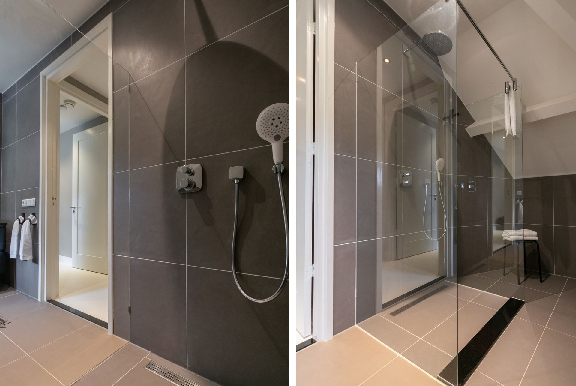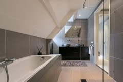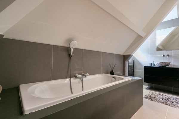 De badkamer op deze verdieping is uitgevoerd in grijstinten, met witte dak- en plafondpanelen. De ruimte is compleet ingericht met een inloopdouche met regendouche, ligbad en een breed badkamermeubel met dubbele wastafel. Een comfortabel geheel!