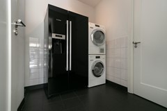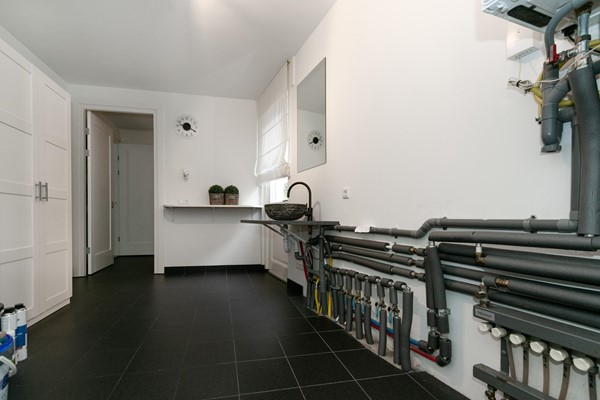Achter de keuken ligt een praktische bijkeuken, inclusief aansluitingen voor witgoed, met doorgang naar de garage. Deze is voorzien van een extra spoelbak, de vloerverwarmingsinstallatie en cv-ketel. De garage is keurig betegeld, heeft een hardhouten poort en is strak afgewerkt.