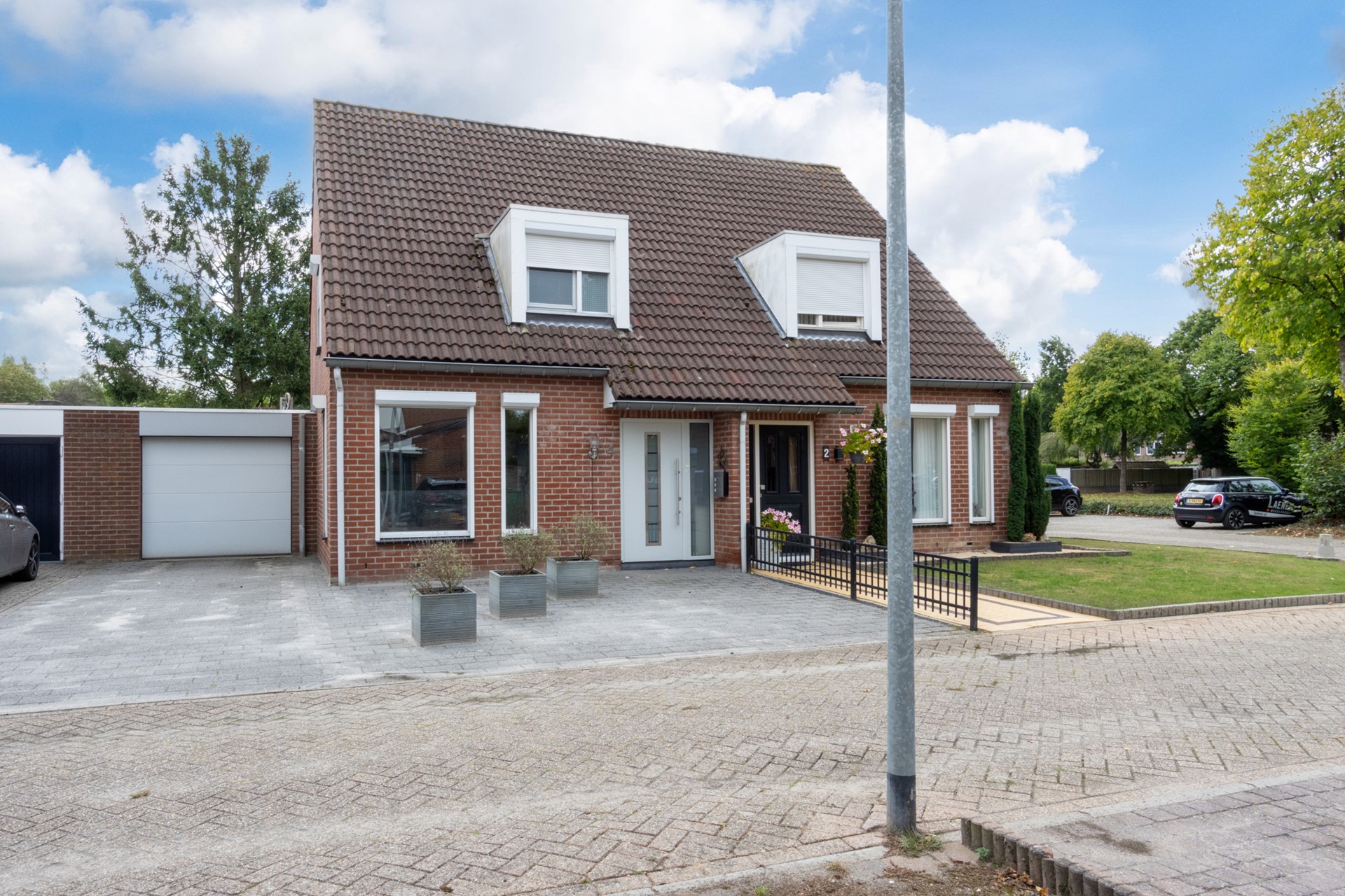 De voortuin is eveneens onderhoudsvriendelijk en draagt bij aan de nette uitstraling van de woning. De oprit biedt plaats aan meerdere auto’s en leidt naar de aanpandige garage, die zowel van binnenuit als via de tuin toegankelijk is. Deze garage is voorzien van water, elektra en een elektrische deur.
