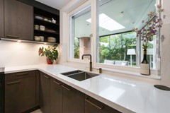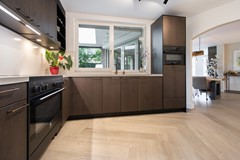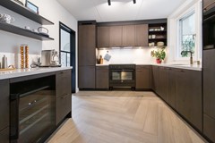 De keuken, eveneens vernieuwd in 2023, is hoogwaardig afgewerkt met een composiet werkblad, houten kasten en uitgebreide inbouwapparatuur waaronder koelkast, diepvries, vaatwasser, oven, combi-oven, inductiekookplaat, afzuigkap, wijnkoeler en cooker-kraan.
